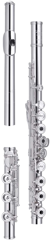 Handmade flute with sterling silver lip plate, riser and barrel, silver plated nickel silver body, footjoint and key mechanism. Open holes, D# roller, French style pointed tonearms, drawn toneholes and pinless partial Brögger System.