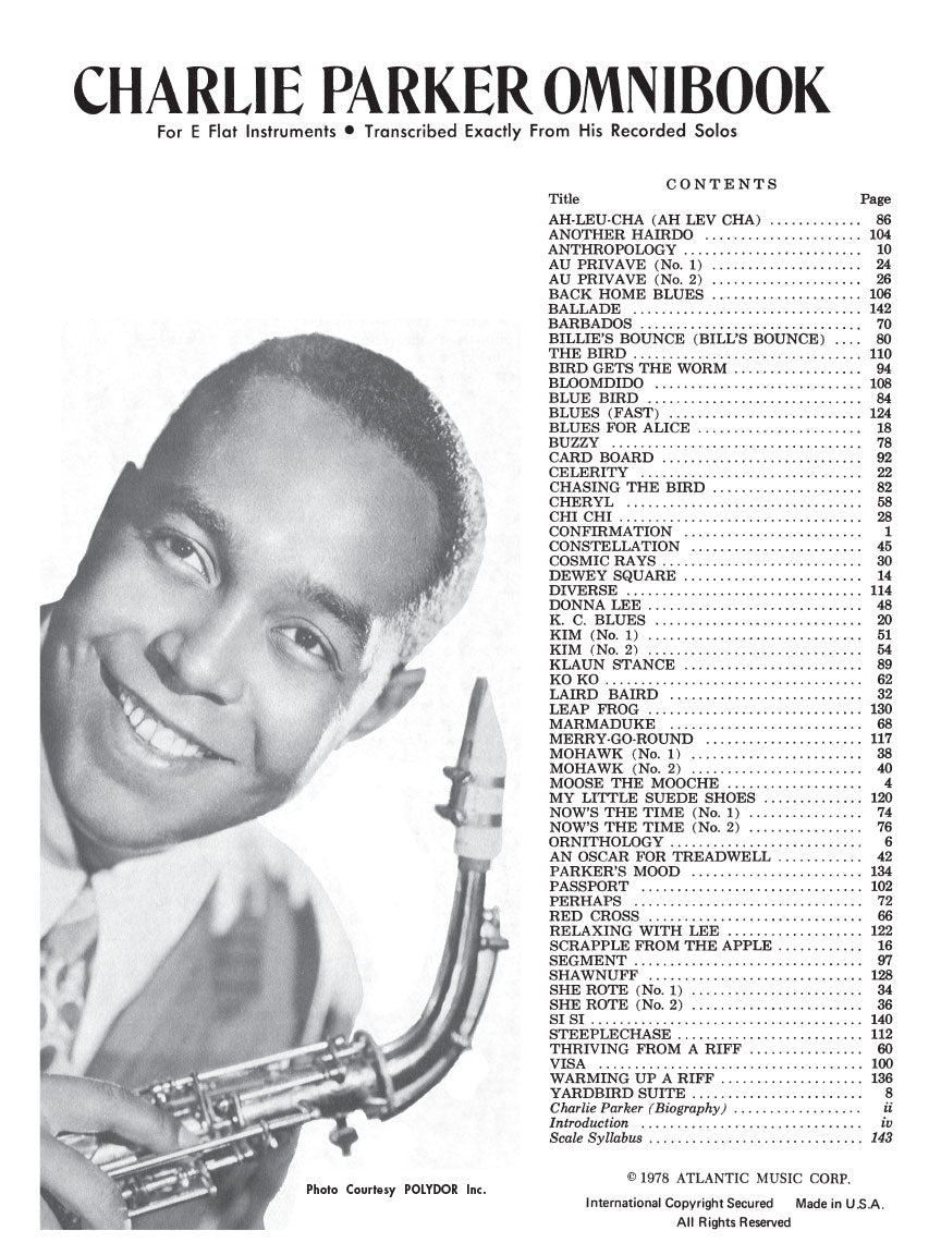 Includes 60 solos such as Anthropology • Au Privave (Nos. 1 and 2) • Billie's Bounce • Blues for Alice • Chi Chi • Confirmation • Constellation • Dewey Square • Donna Lee • Ko Ko • Moose the Mooch • Ornithology • Scrapple from the Apple • Shawnuff • Yardbird Suite • and more.