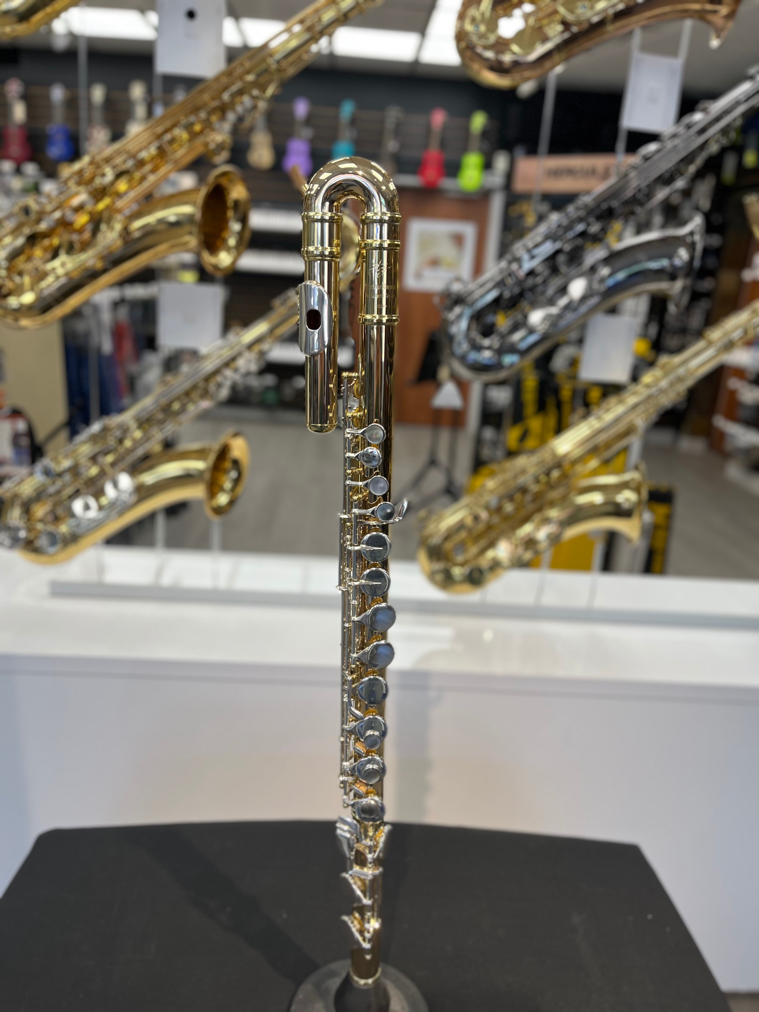 The body tubing is comprised of 85% copper with the remaining 15% consisting of other metals to enable the tubing to be made strong enough to be used for alto flute production and drawing of tone holes. The instrument features beautiful mother of pearl touch-pieces and includes a curved and straight headjoint.