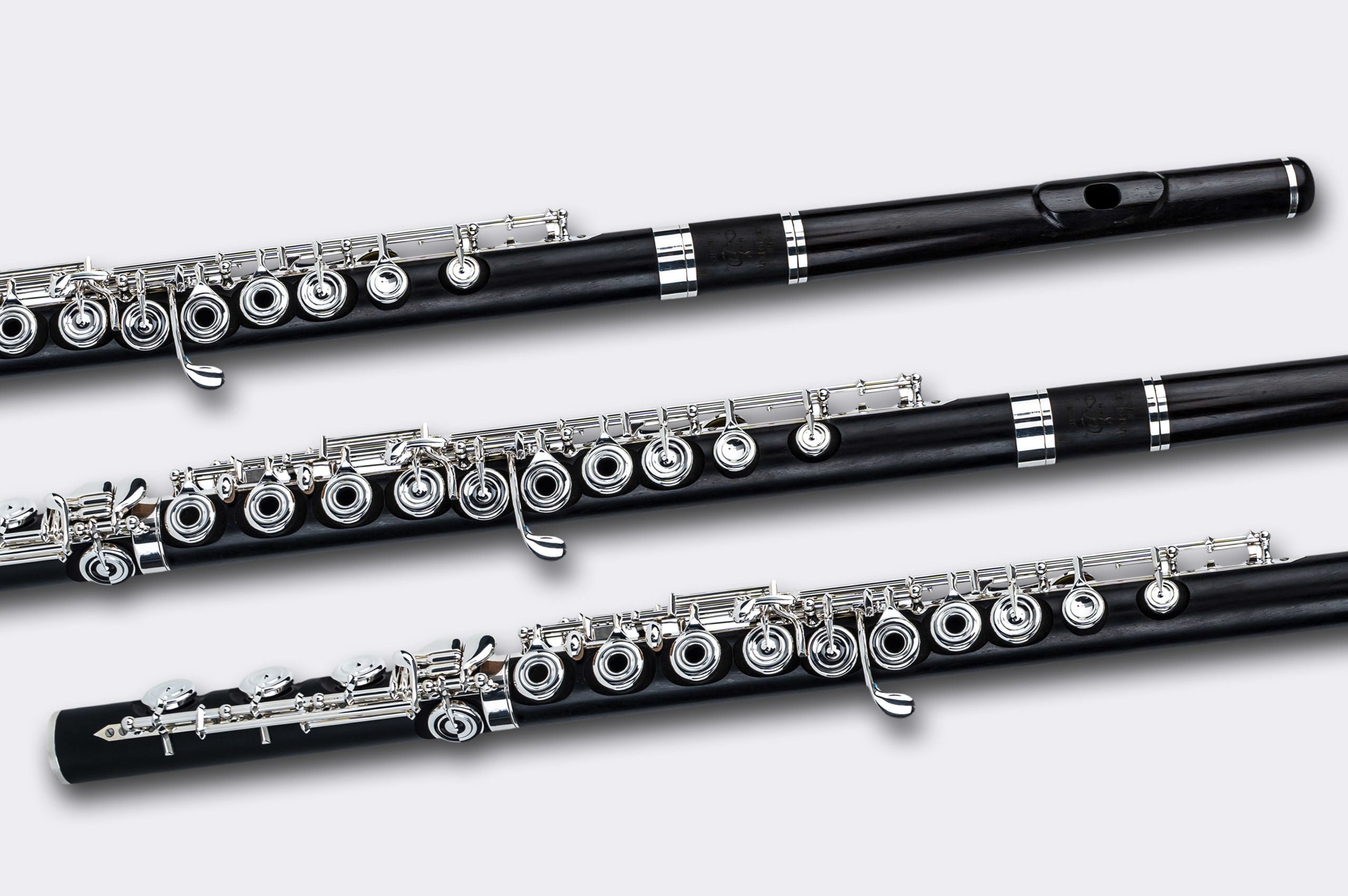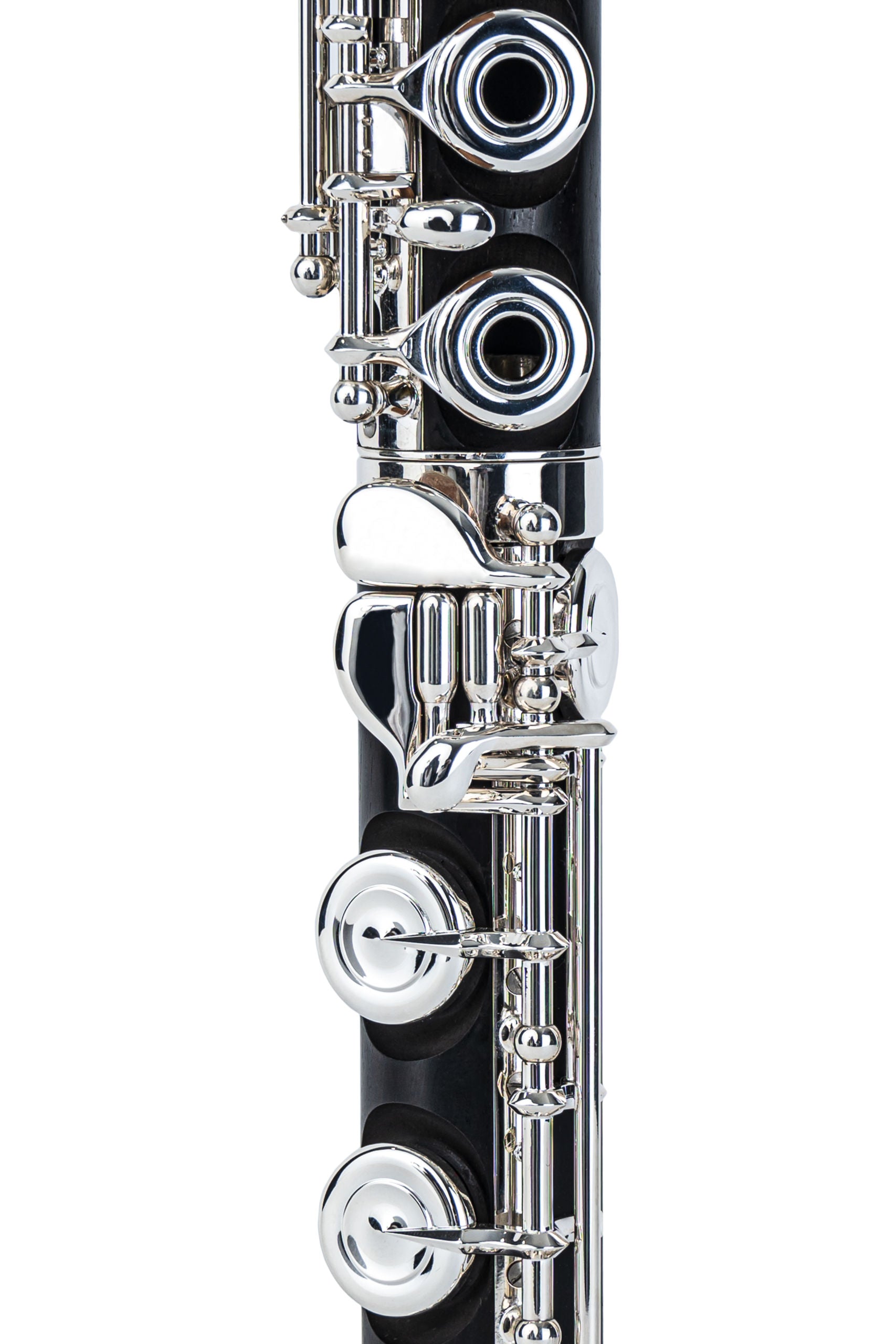 Professional flute in grenadilla, open-holes, pointed harms, silver plated keys and B foot
