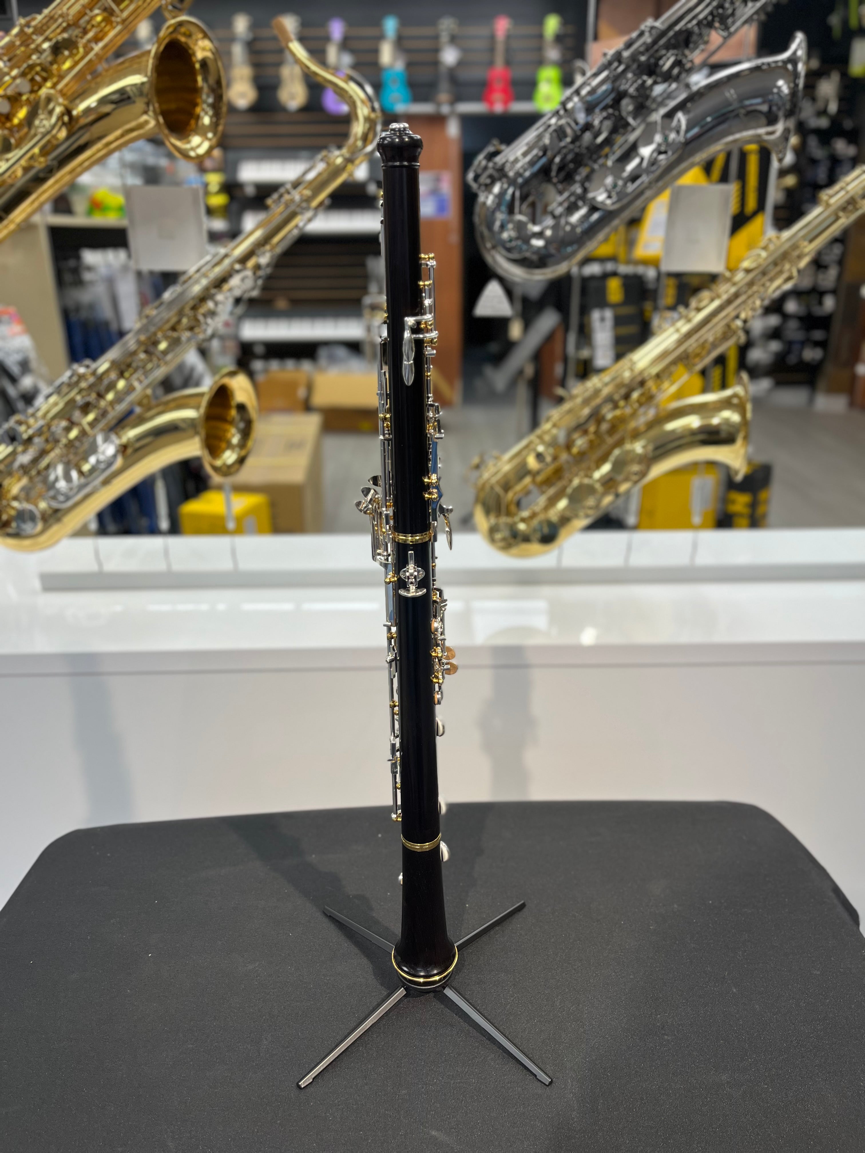 This intermediate oboe is made with a wooden body, silver plated keys and gold posts. It has a full keying system and was adjusted in our Quebec City repair shop.