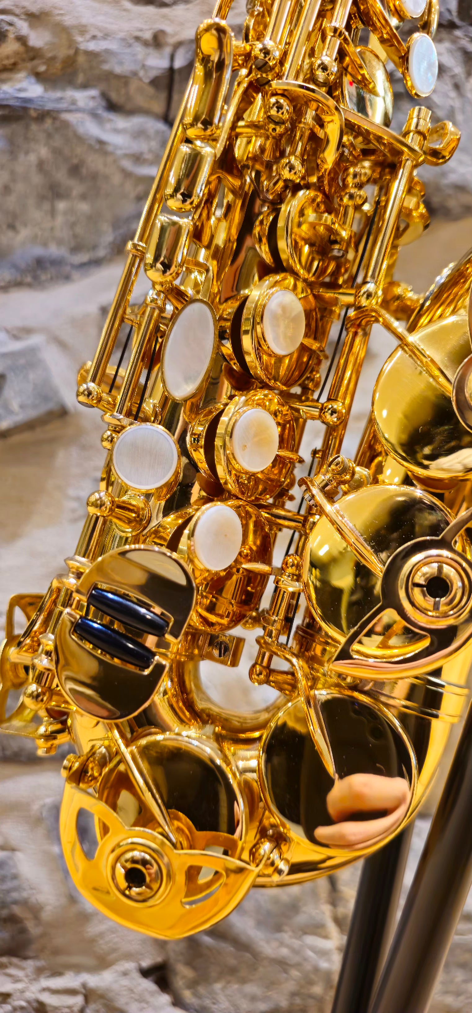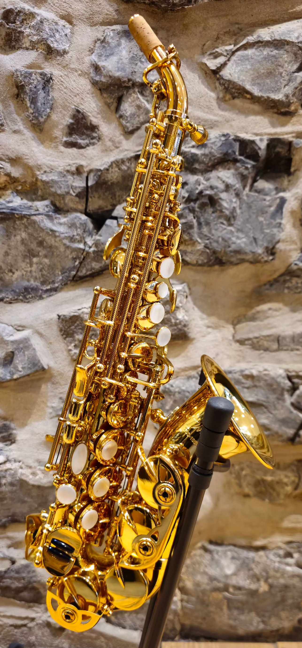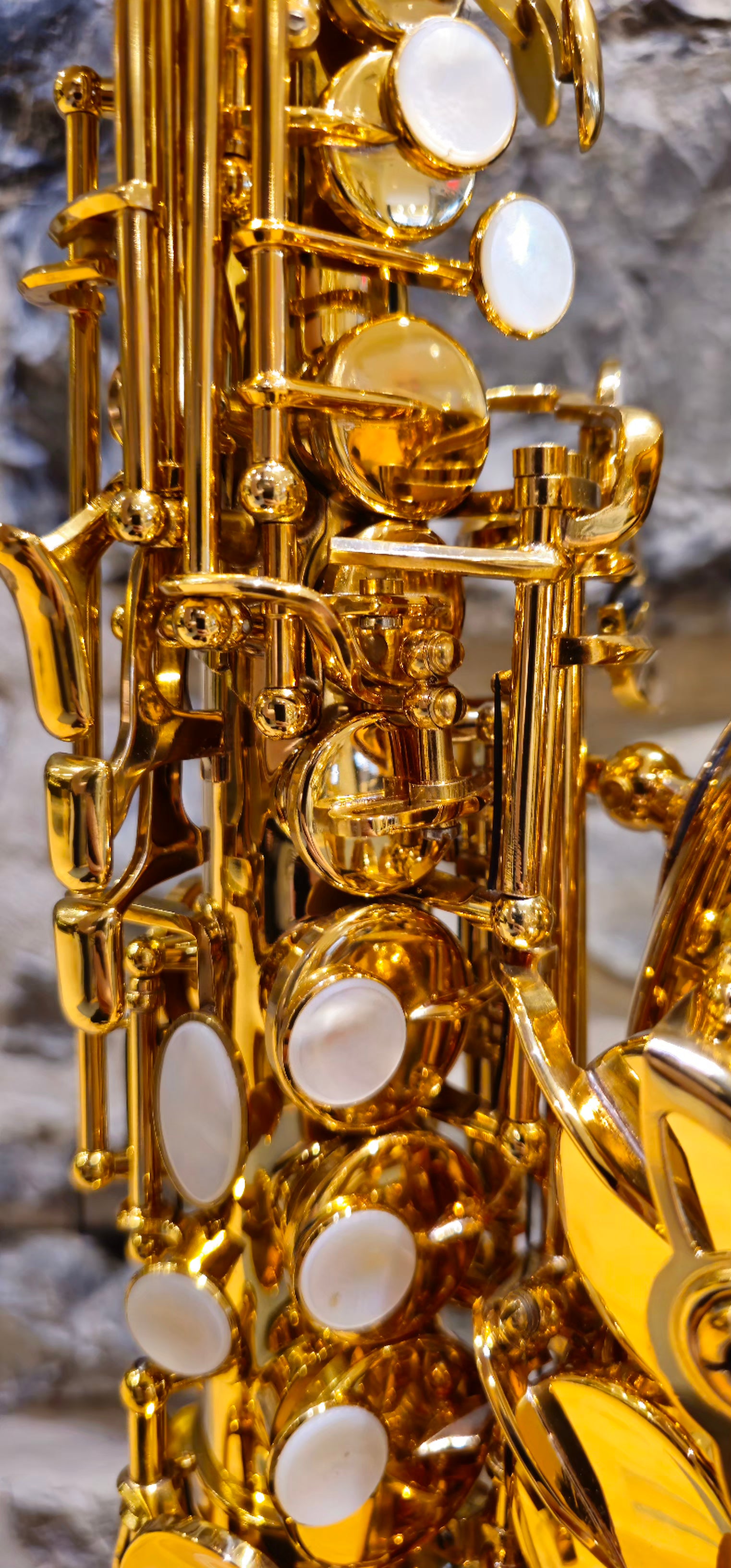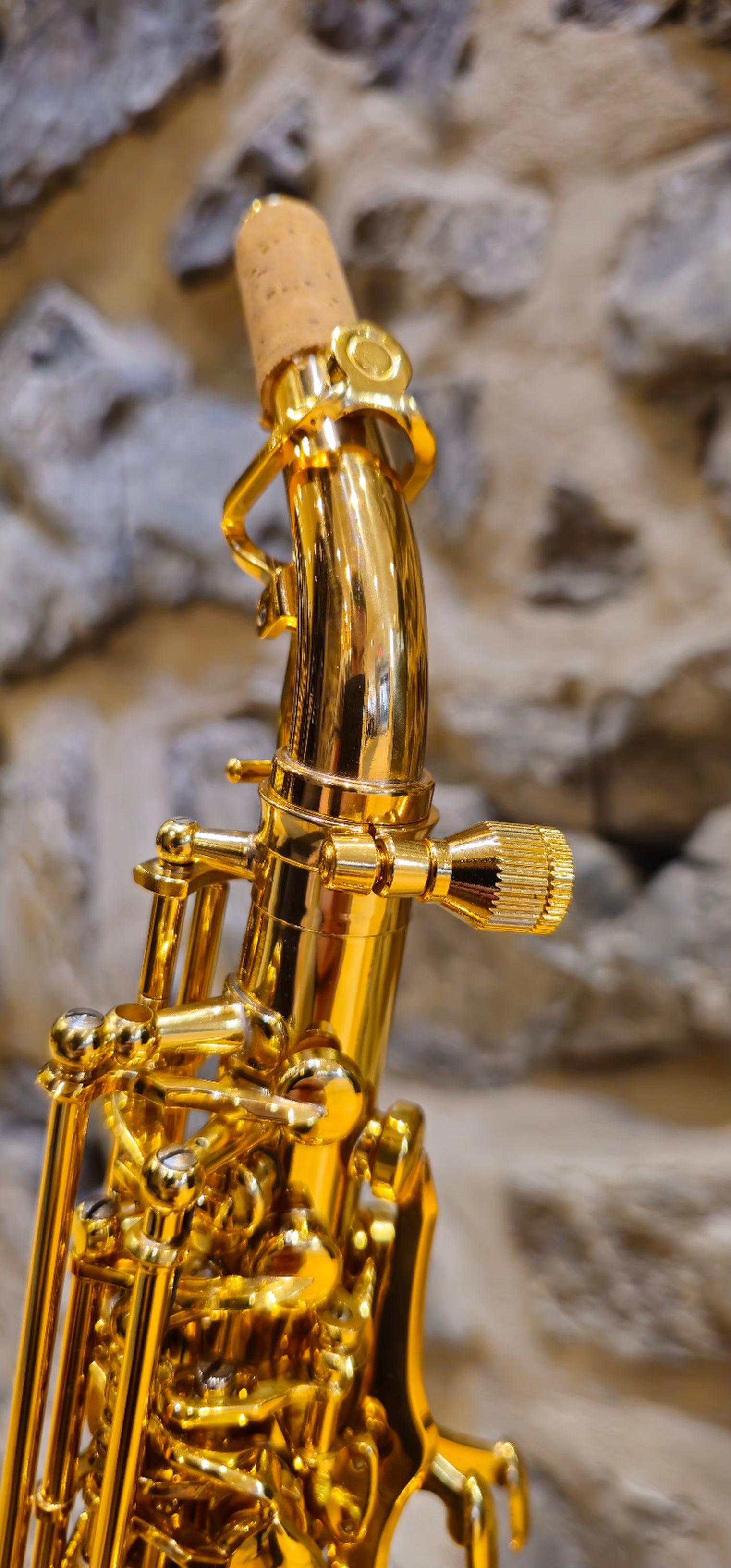 This step-up student/intermediate model is a great model in terms of sound and quality. It is suitable for all styles of music, has an Yanagaisawa style octave key, a customizable heavy weight neck screw, great economy and a nice gold finish. It is made with brass body and keys, mother of pearls, engravings on the bell, and durable Pisoni pads. It comes with a backpack case, cleaning kit, mouthpiece and a special curved soprano strap.
