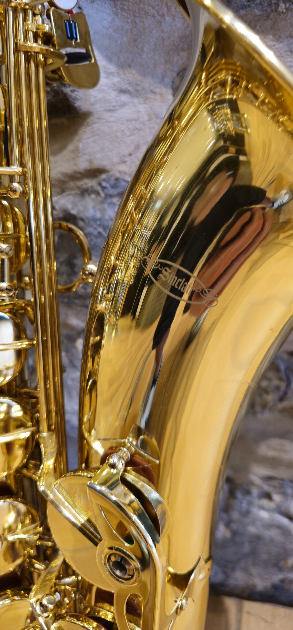 This student saxophone is a good entry level instrument for a beginner. It has an inverted octave key like a Yanagisawa, the High F# key, a clear lacquer and double braces on some keys. It comes with a hard but lightweight case.