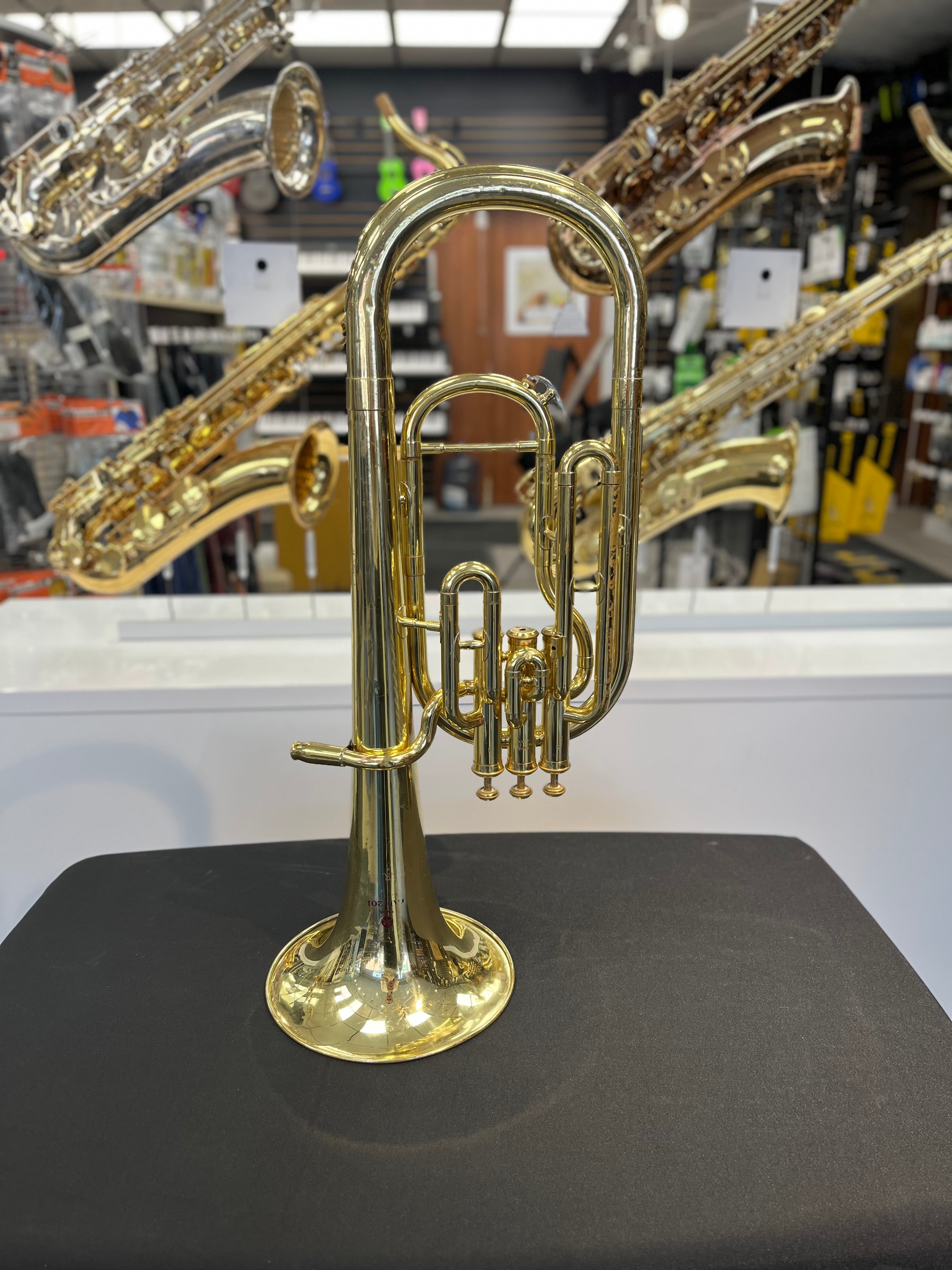 Yamaha YAH-201 alto horn, refurbished and ready to play, offering a rich and powerful sound. Comes with a hard case.