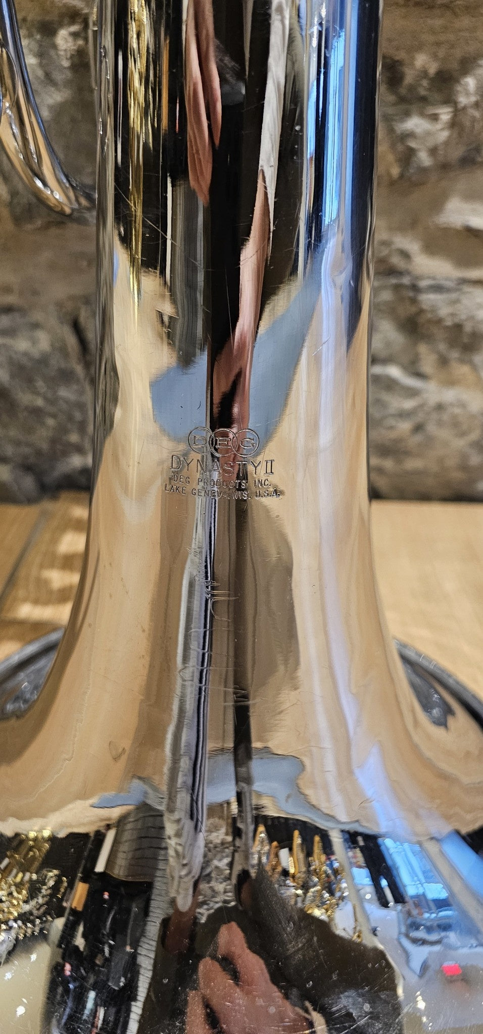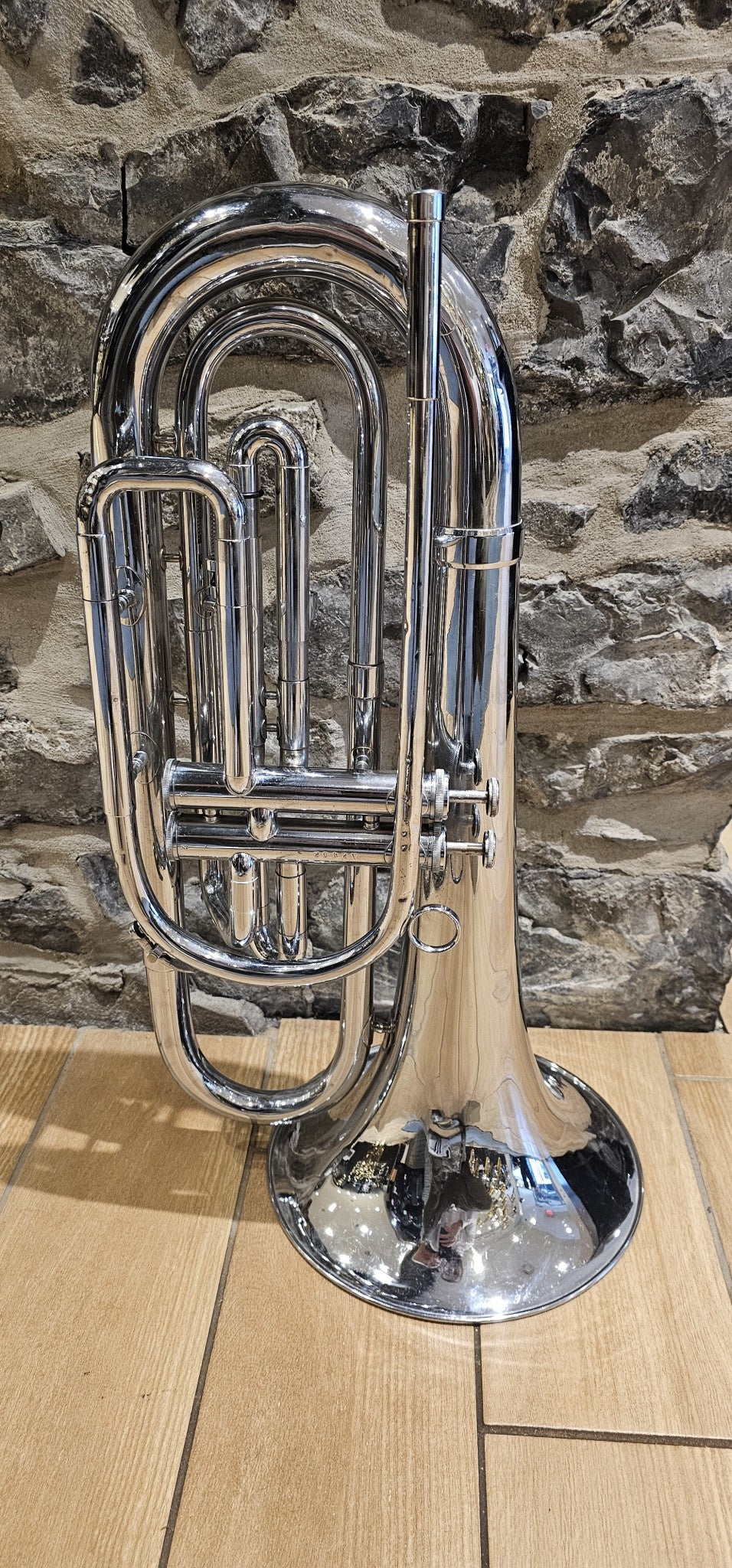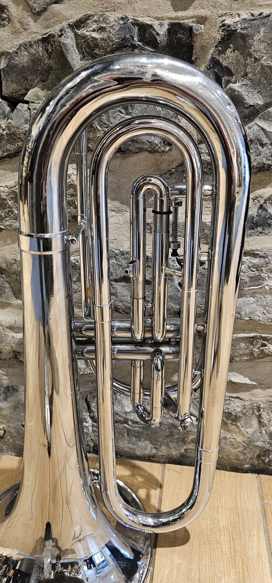 This marching baritone has 2 valves and is plated in nickel. It does not have a case with it and we offer one year guarantee on the adjustments. It works with any small shank trombone mouthpiece and is tuned in G