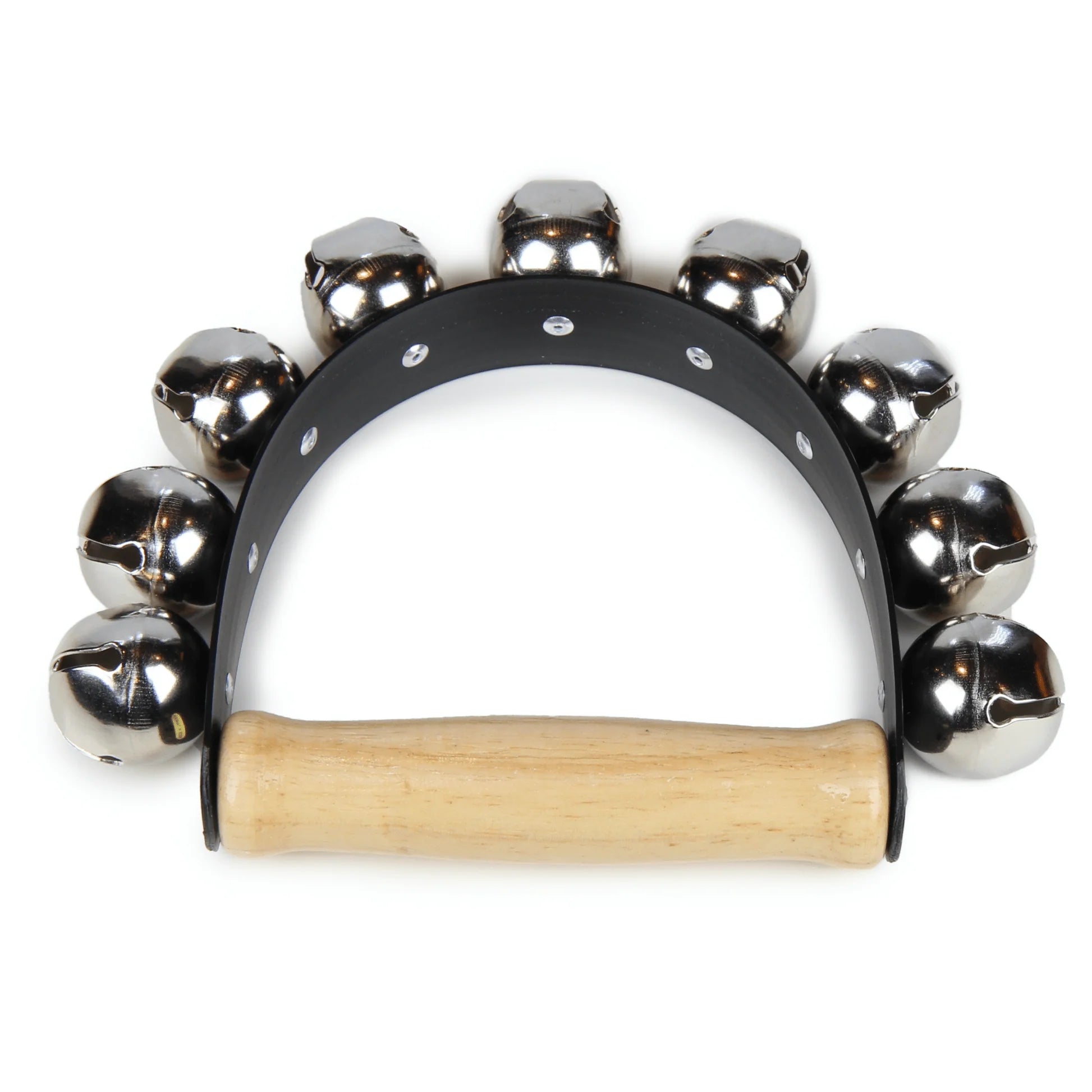 These JLTPerc. Sleigh Bells (9) feature nine bright-sounding bells securely attached to a comfortable wooden handle. They produce a crisp, festive jingle—perfect for classroom use, music therapy, or adding sparkle to any percussion ensemble. Durable and easy to play, they deliver a clear, cheerful sound with every shake.