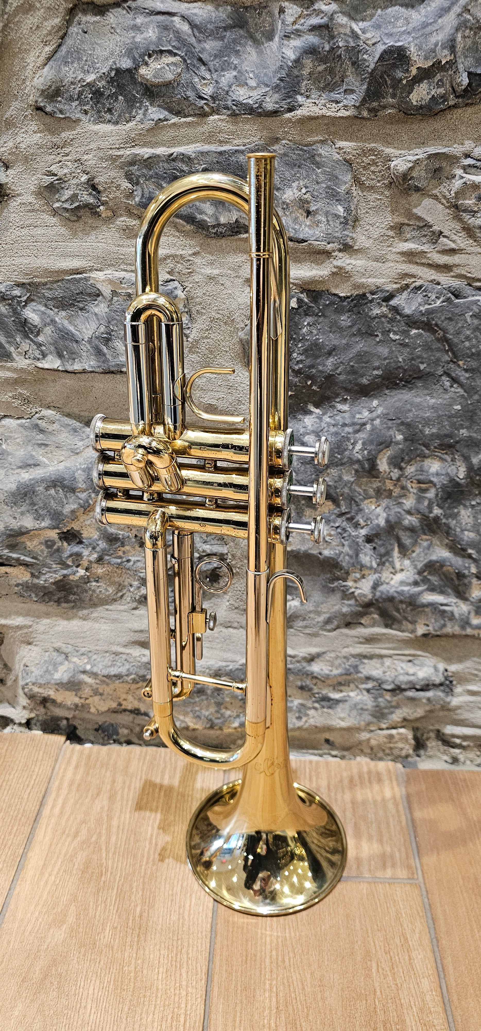 This student trumpet was made in the USA and cleaned in our Montreal repair shop. It is a great model for a beginner with a sturdy construction, gold brass lead-pipe and yellow brass bell. It comes with a hard case and one year guarantee.