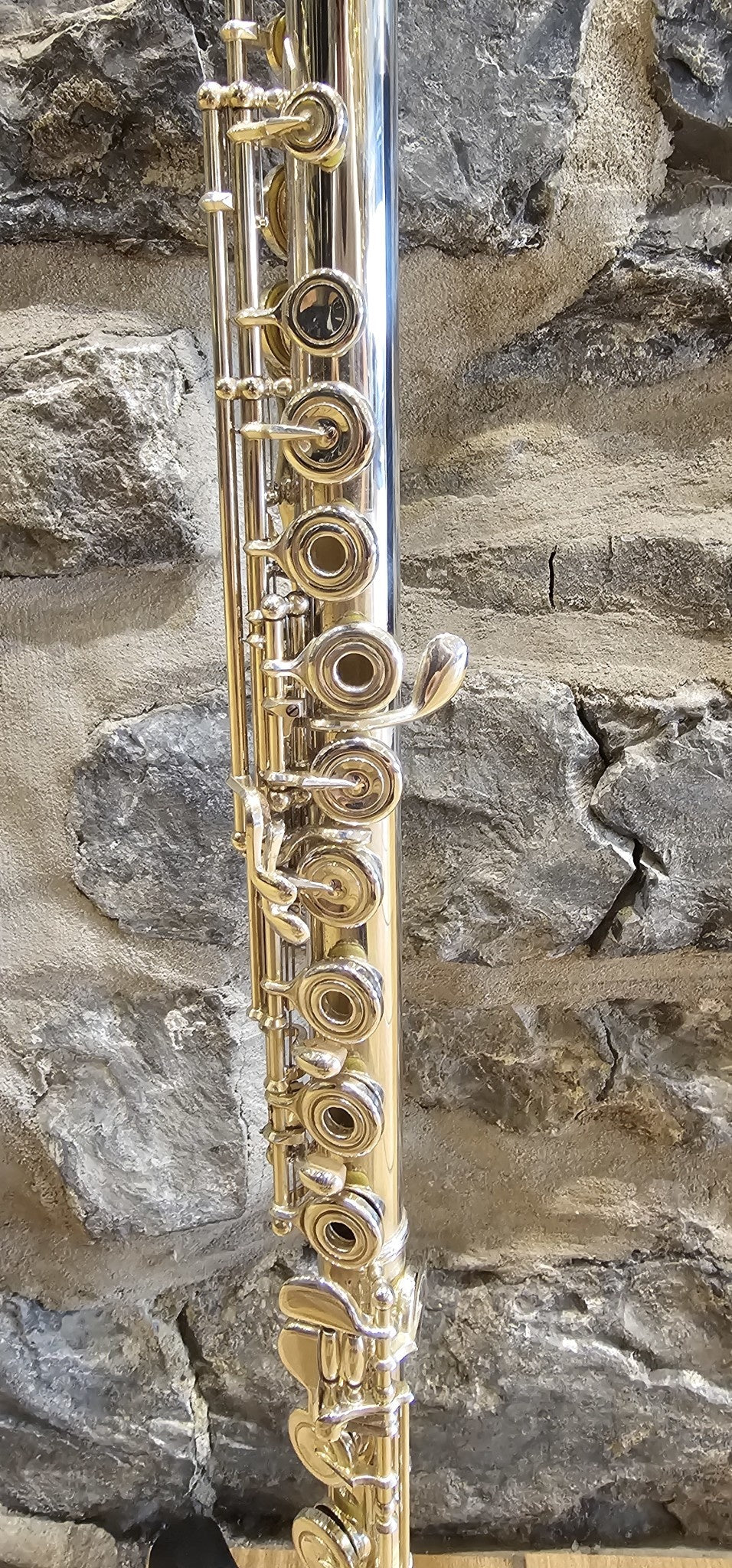 Cette flute est fabriquée avec une tête en argent Sterling de style AM ainsi que la clé de Mi mécanique. Elle a également le Do# trille, une patte de Si et les plateaux ouverts. Elle offre un son riche et une belle résonance.
