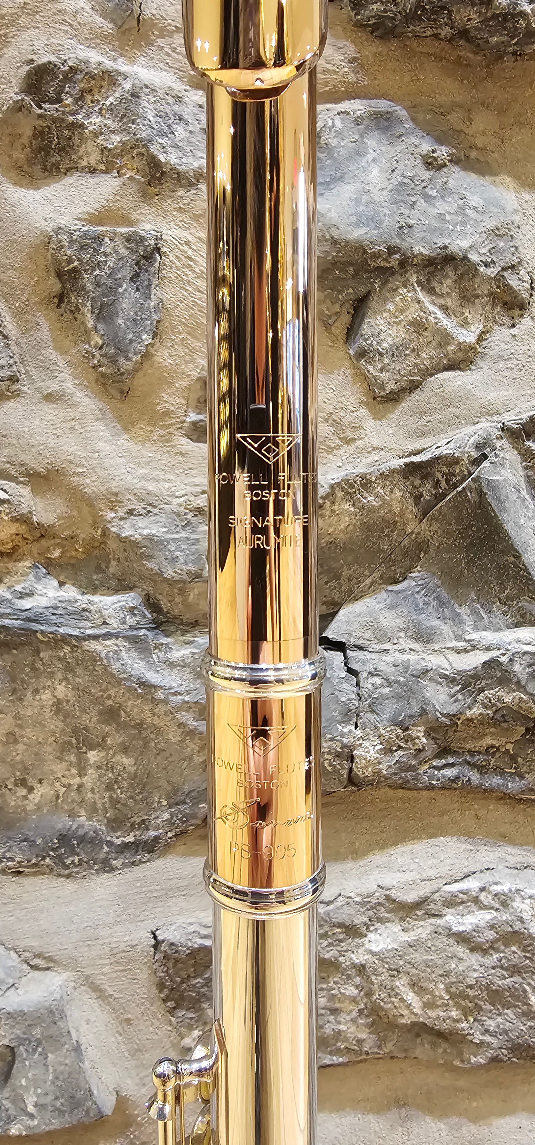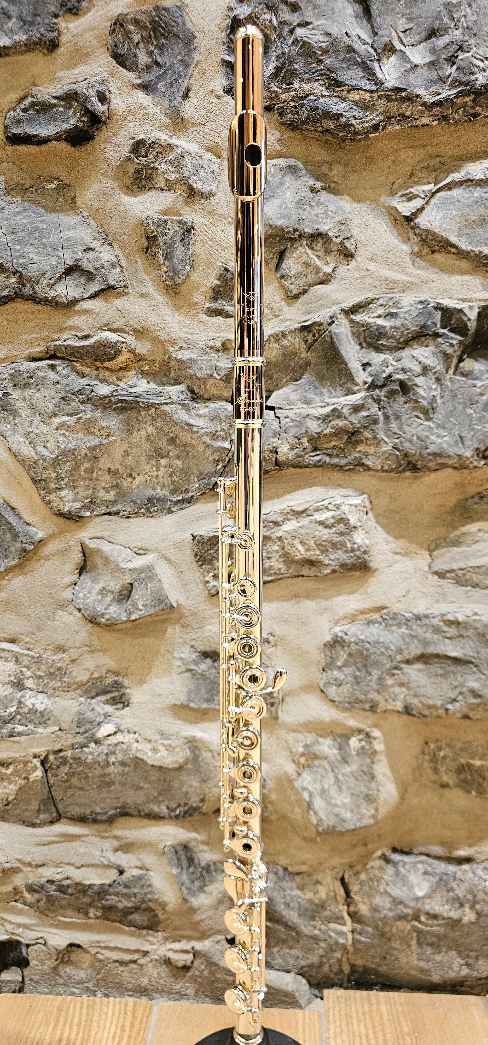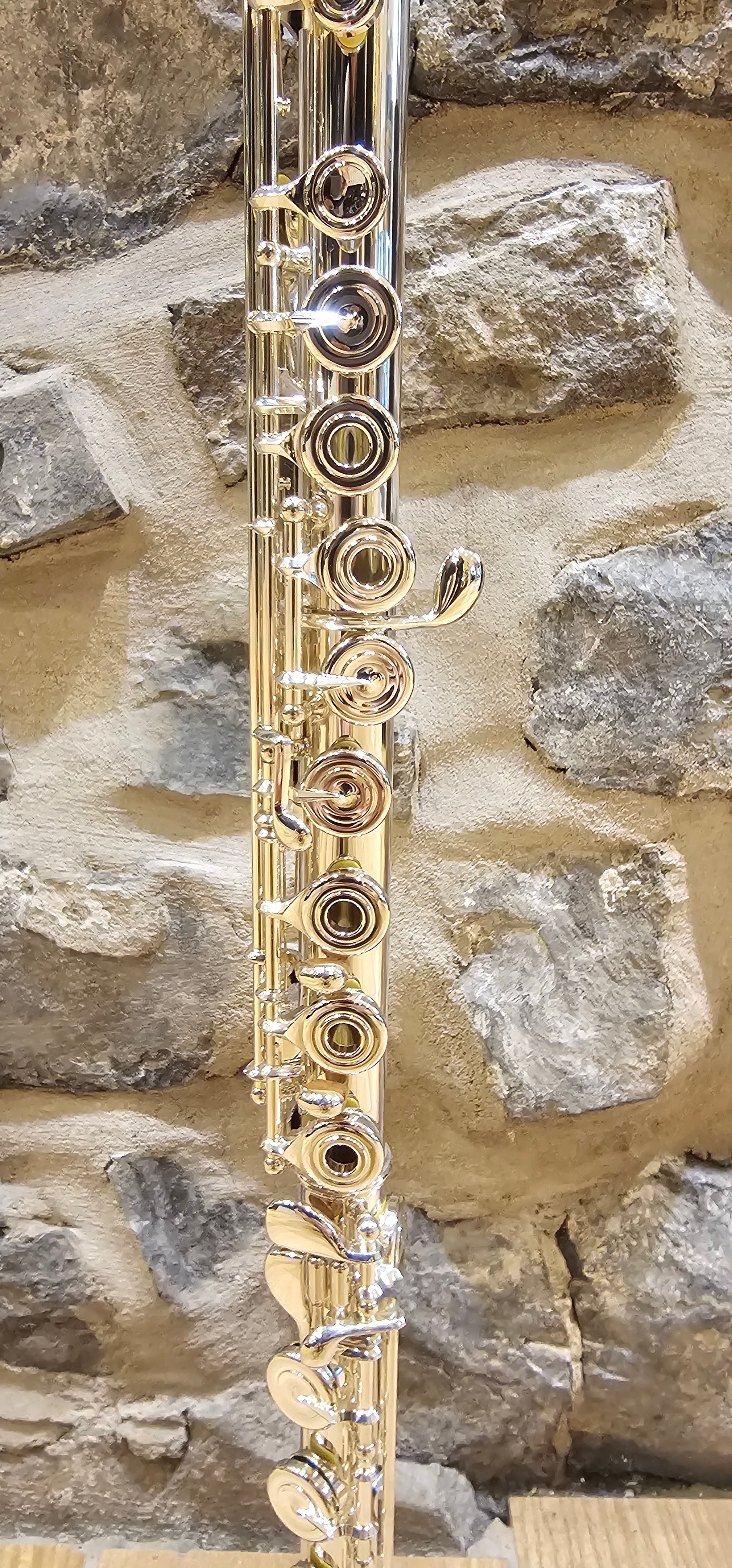Cette flûte professionnelle est fabriquée aux États-Unis avec un corps et tête en argent Sterling, une couronne, tête et baril en Aurumite 9 k. Celle-ci a aussi des ressorts en or blanc 10 k, des tampons Straubinger, patte de Si et le Sol décalé.