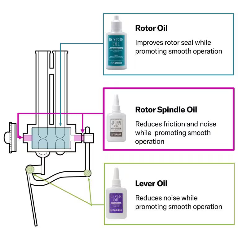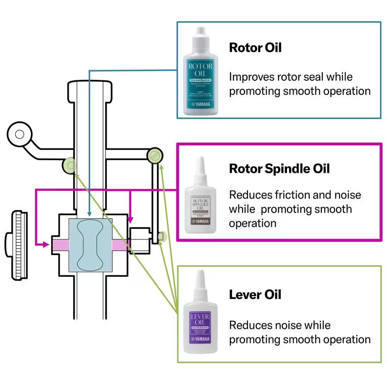 Retirez les capuchons des valves et appliquez un peu d'huile pour broche de rotor entre les broches et les roulements des vannes rotatives. Après avoir refermé le capuchon de la valve, actionnez le levier plusieurs fois pour répartir uniformément l'huile.