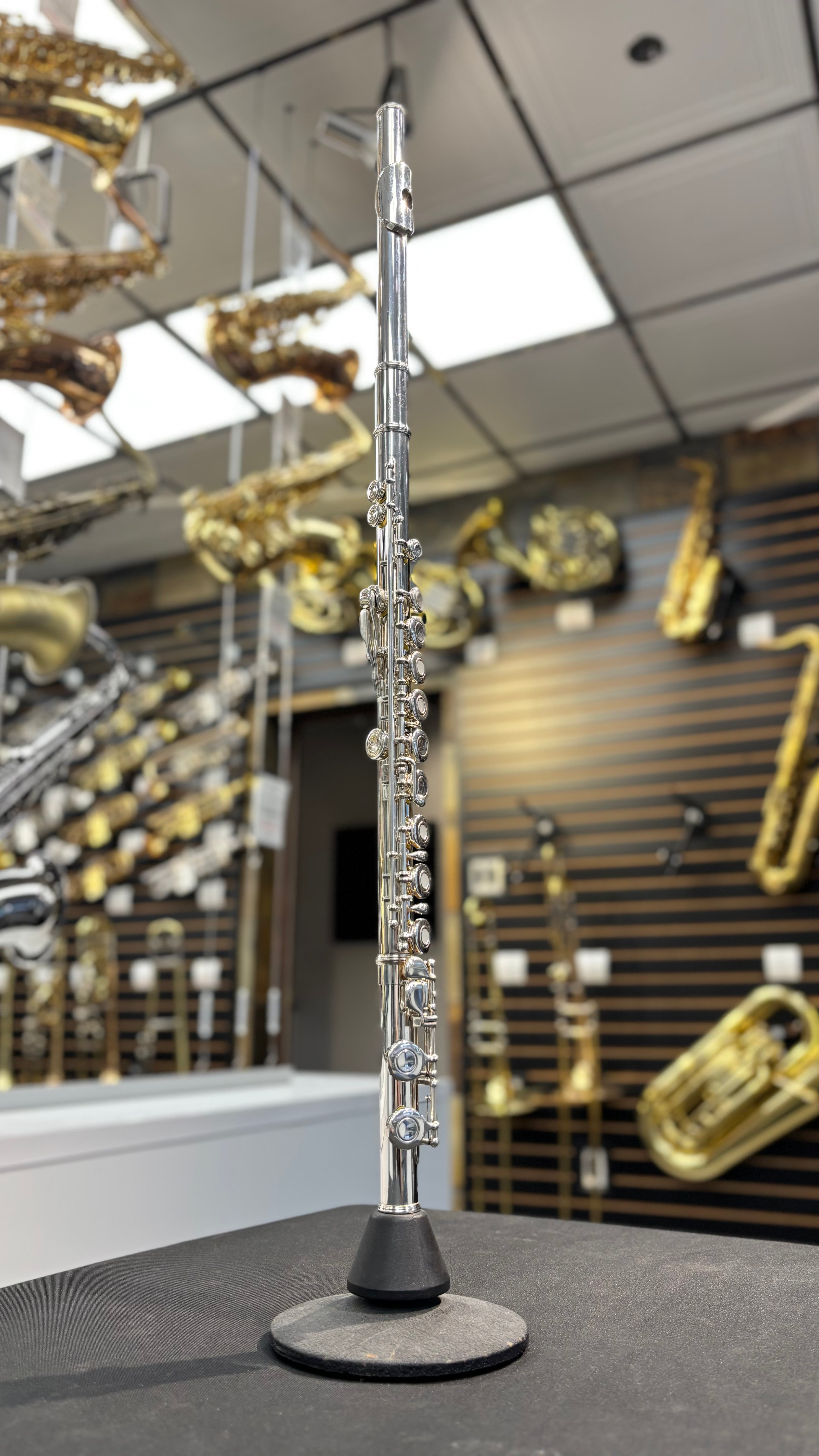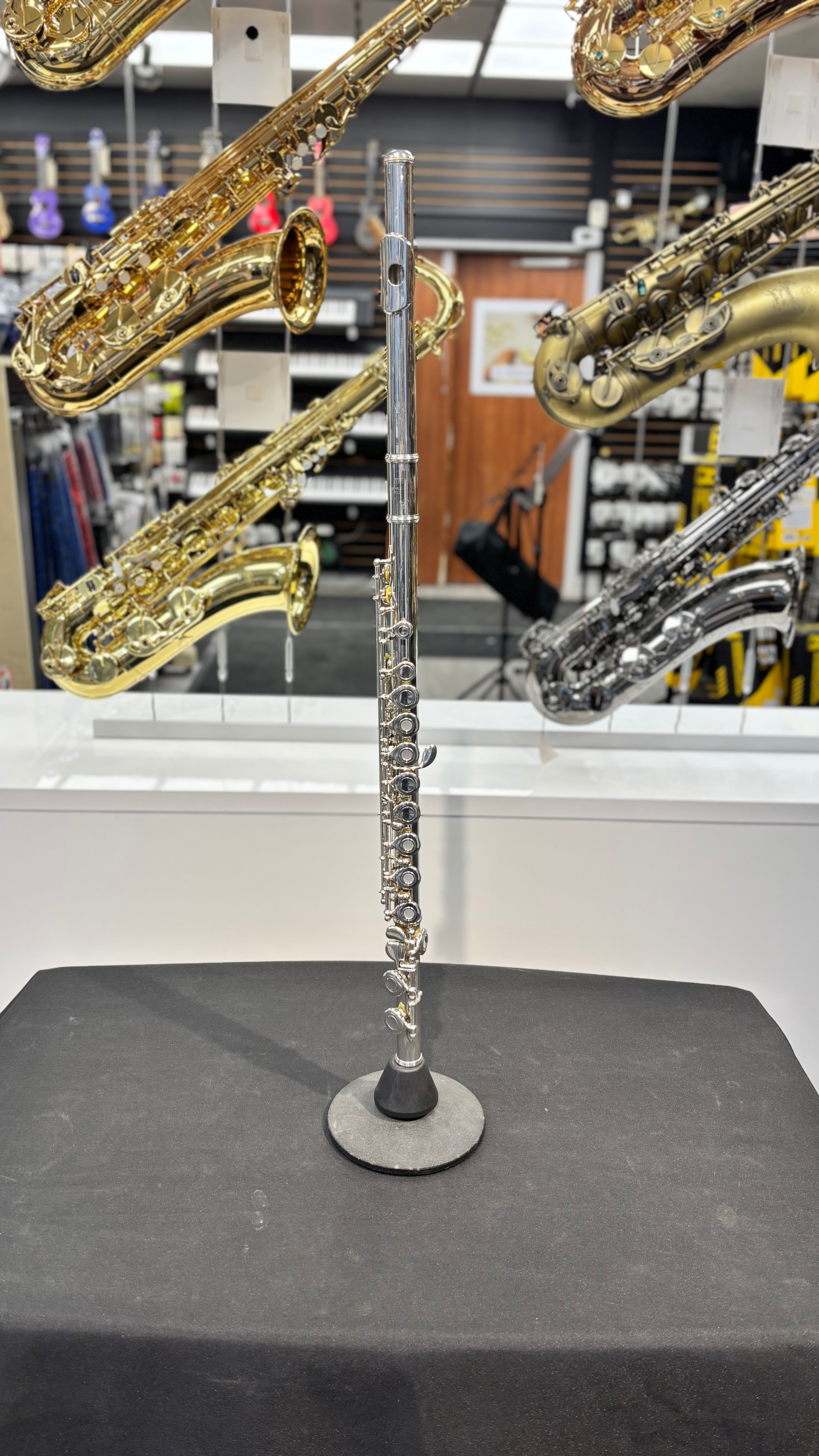 Cette flûte traversière de niveau intermédiaire possède une tête et un corps en argent massif, une patte de Do, des plateaux ouverts et une clé de sol en ligne. Elle a été réglée dans notre atelier de réparation de Québec et est vendue avec un étui rigide.
