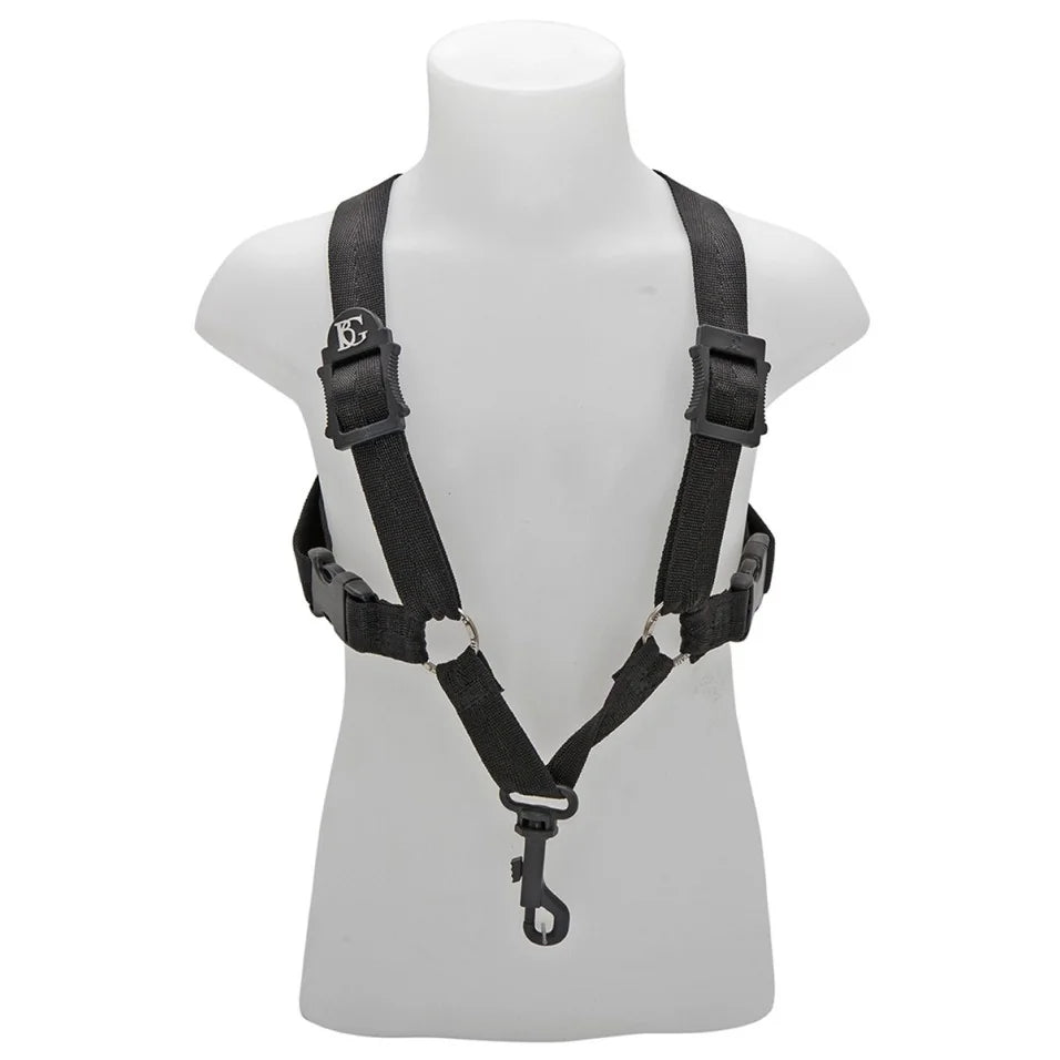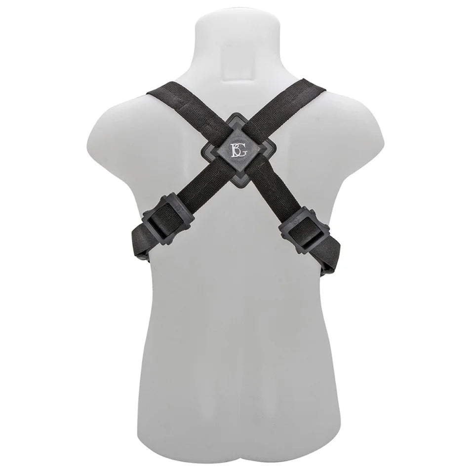 Le harnais BG pour saxophone répartit uniformément le poids de l'instrument sur le haut du corps.