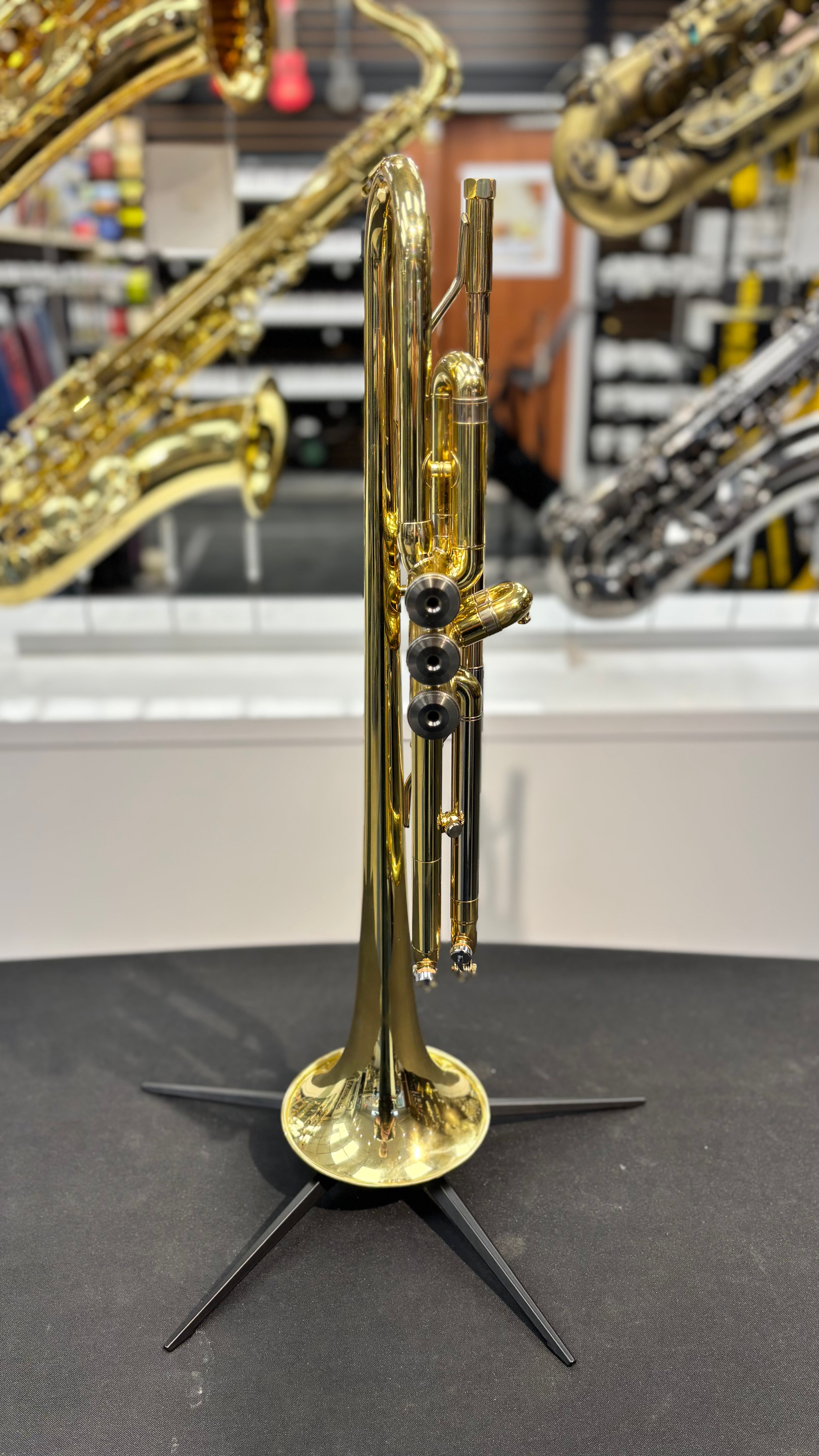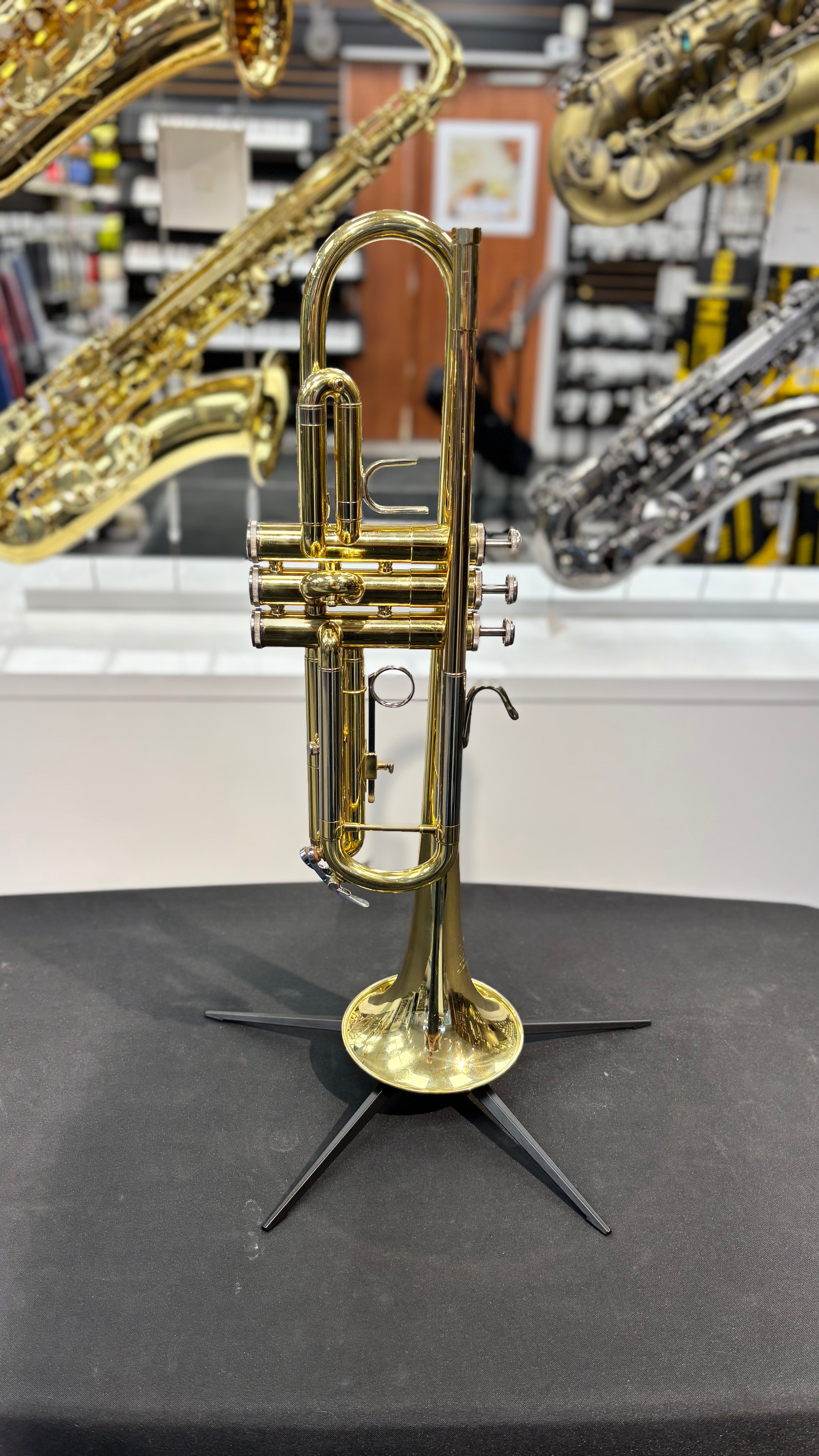 Cette trompette d'étude a été fabriquée aux États-Unis, à Elkhart. Elle possède une perce de 11,7 mm (0,459 po), un pavillon en laiton jaune de 12,1 cm (4,75 po) et une finition vernie transparente. Elle a été ajustée et nettoyée dans notre atelier de réparation de Québec et est vendue avec un étui rigide.