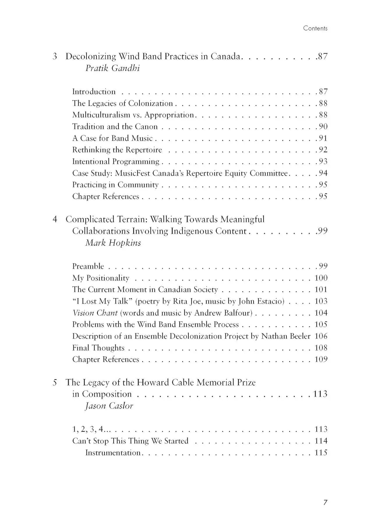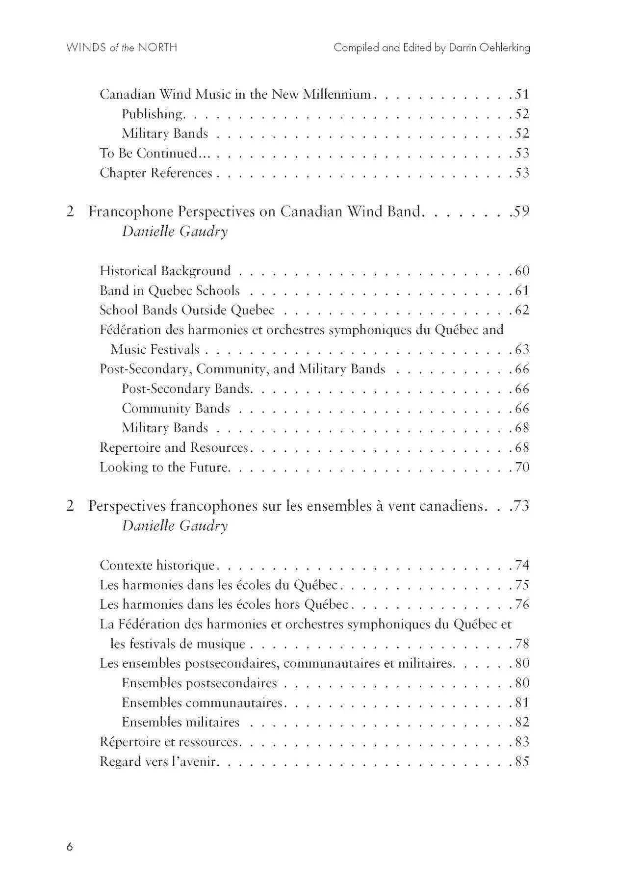 Les chapitres de la première partie abordent divers sujets, notamment un aperçu de l’histoire des orchestres d’harmonie canadiens, les perspectives franco-canadiennes (présentées en français et en anglais), la décolonisation des pratiques des orchestres d’harmonie, des collaborations autochtones significatives, ainsi que d’autres héritages importants et enjeux contemporains. Il est important de noter que tous les chapitres sont présentés dans une perspective du XXIe siècle.