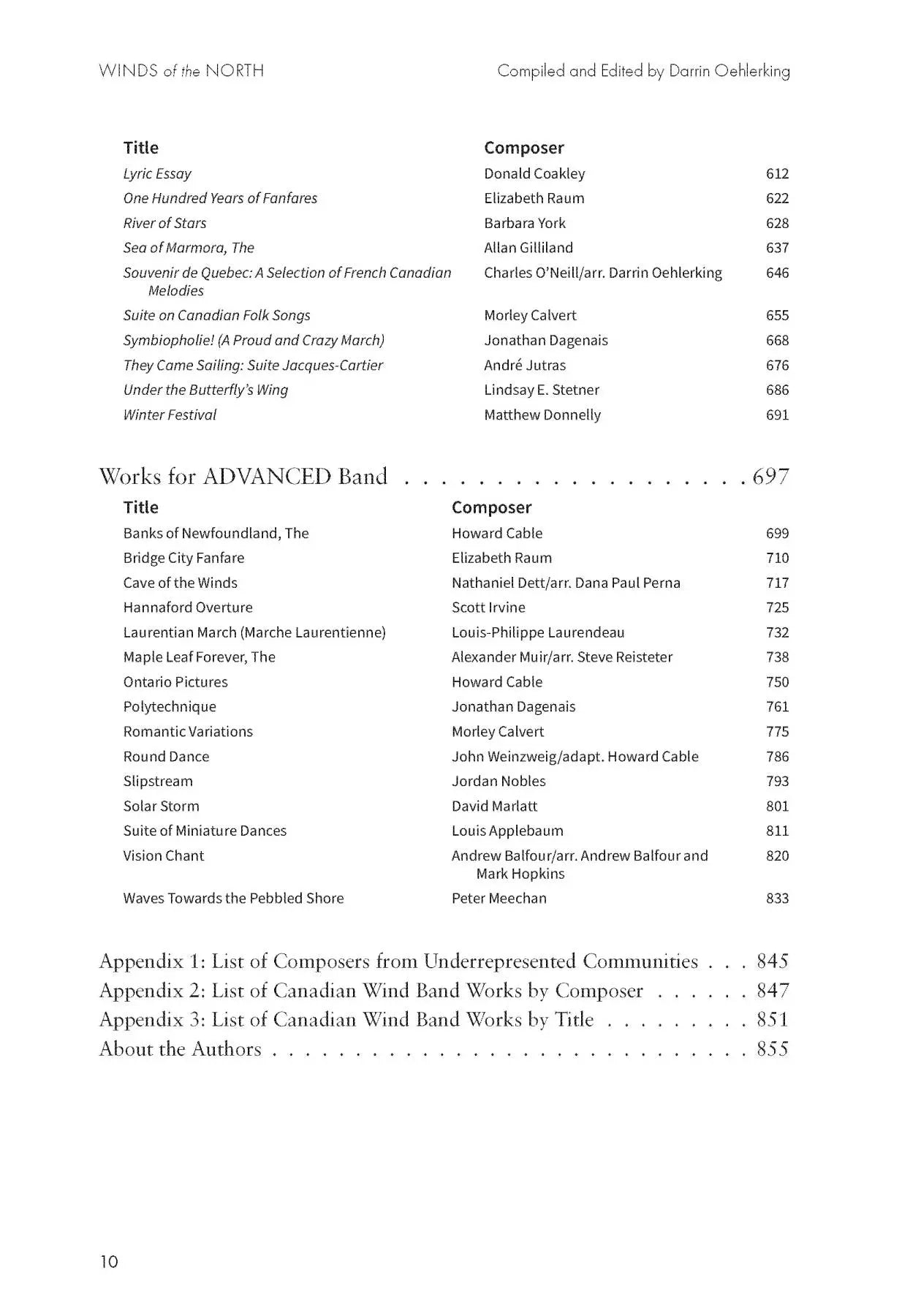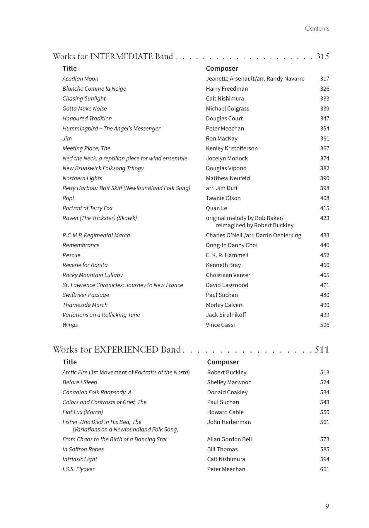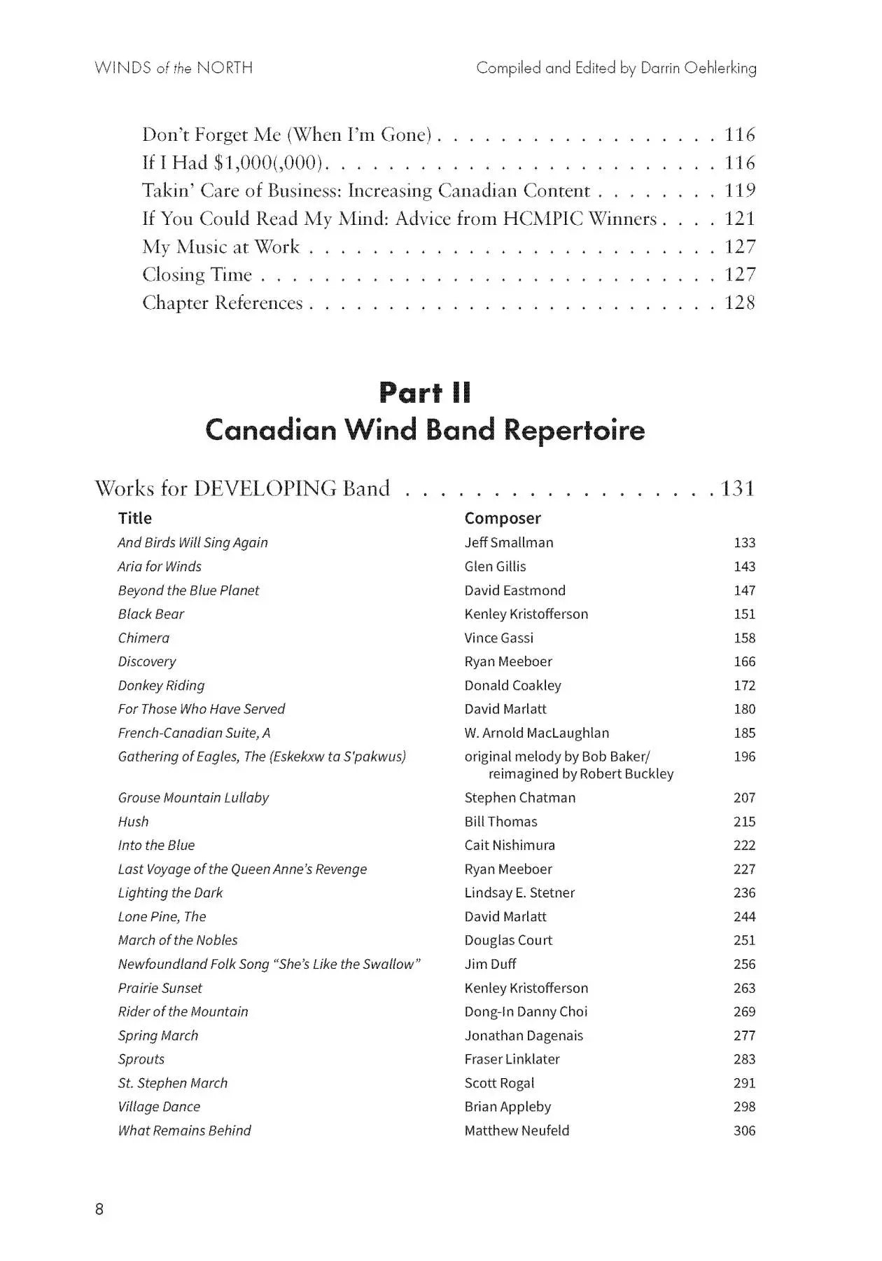 La deuxième partie propose des guides de ressources académiques pour 85 des meilleures œuvres de compositeurs canadiens, classées par niveau de difficulté pour les orchestres d'harmonie de tous niveaux : débutant, intermédiaire, confirmé et avancé. Chaque guide présente des informations sur le compositeur et la composition de l'œuvre, des perspectives historiques et culturelles, des considérations stylistiques, des informations pédagogiques, ainsi qu'un aperçu de la forme et de la structure de l'œuvre. Des ressources et des enregistrements sont également suggérés.