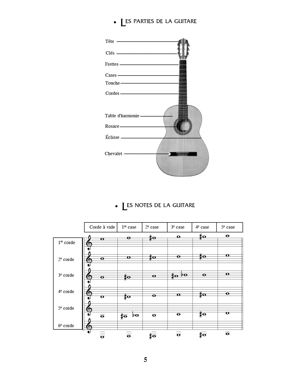 Le second chapitre décrit non seulement l'instrument, mais aussi toutes les conventions d'écriture attachées à la guitare, ainsi que la manière de l'accorder. Commence ensuite l'apprentissage des notes de la guitare et c'est là que les choses deviennent vraiment intéressantes : Sylvain Lemay a organisé sa méthode de manière à ce que cet apprentissage, très progressif et toujours à partir des cordes à vide, se fasse de manière ludique, au sein de très nombreux petits duos adaptés, l'élève étant accompagné par le professeur. Parallèlement à l'étude des notes, et presque sans s'en apercevoir, l'élève apprend aussi à gérer les différentes durées de notes, les rythmes, les altérations, les liaisons, les sauts de cordes et même les changements de position, etc. On peut aussi trouver à la fin de la méthode des exercices techniques allant de l'étude du chromatisme aux mouvements contraires. Bien sûr, les gammes ne sont pas laissées de côté. Un CD, dont la prise de son est excellente, regroupant de nombreux exercices, accompagne cette remarquable méthode.
