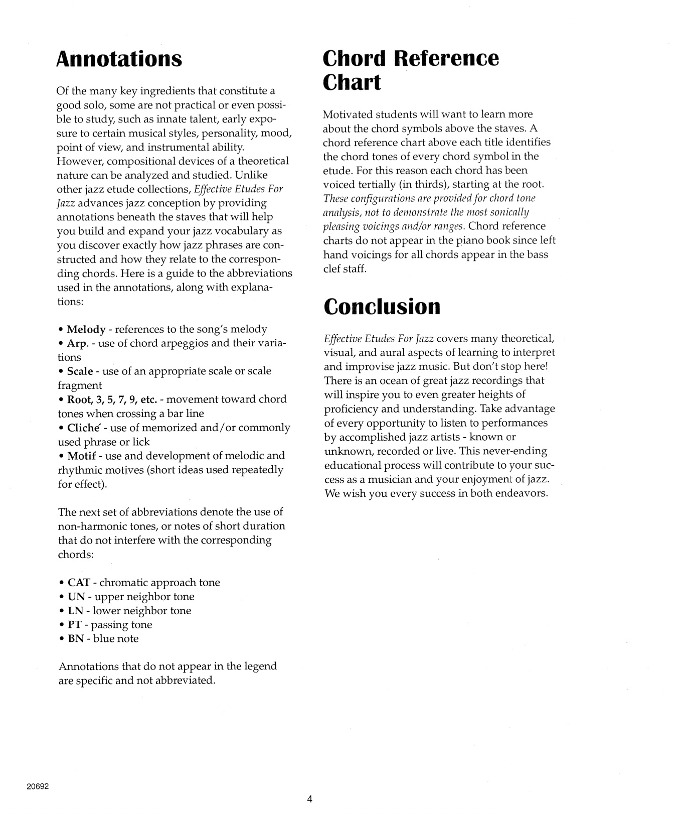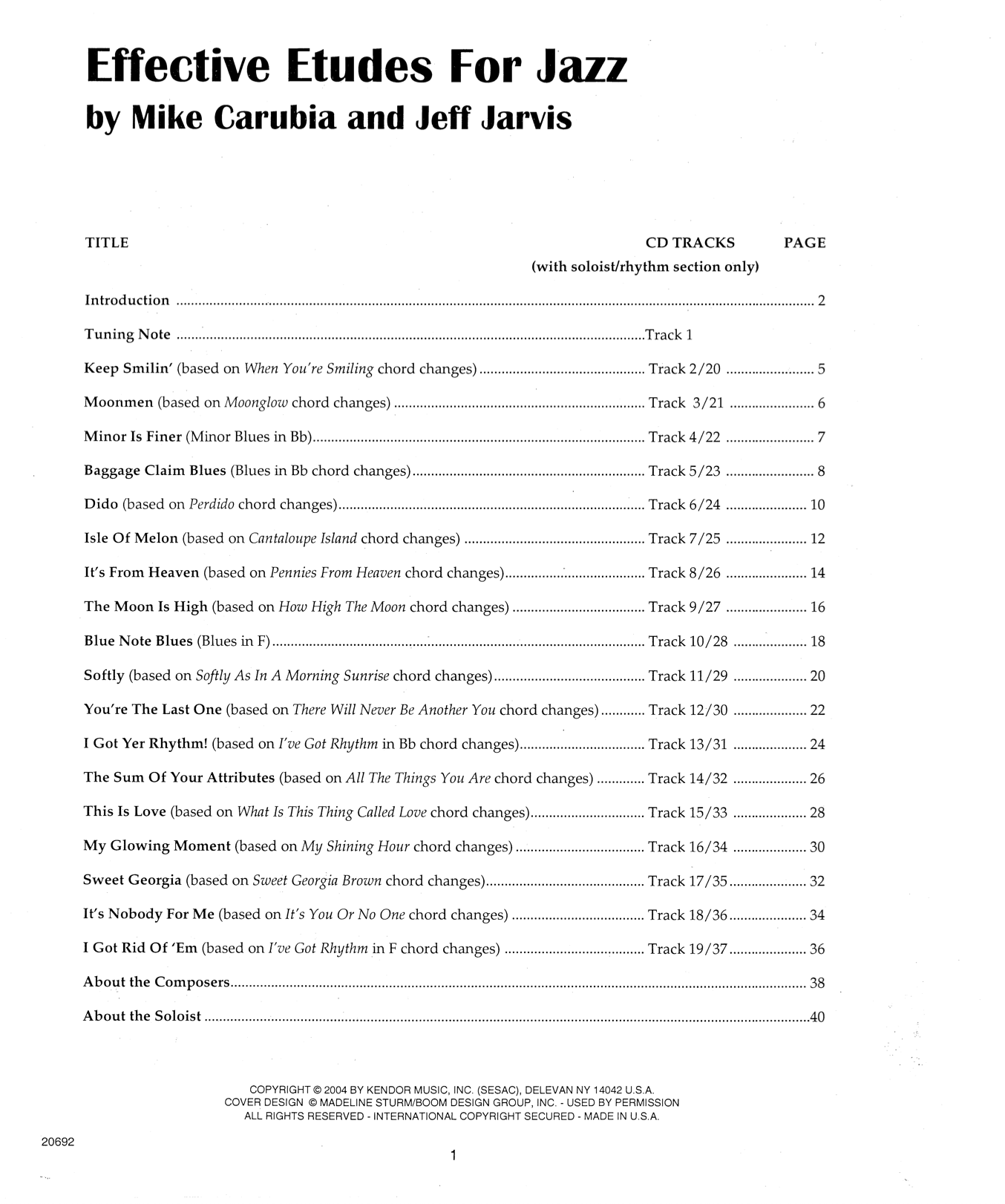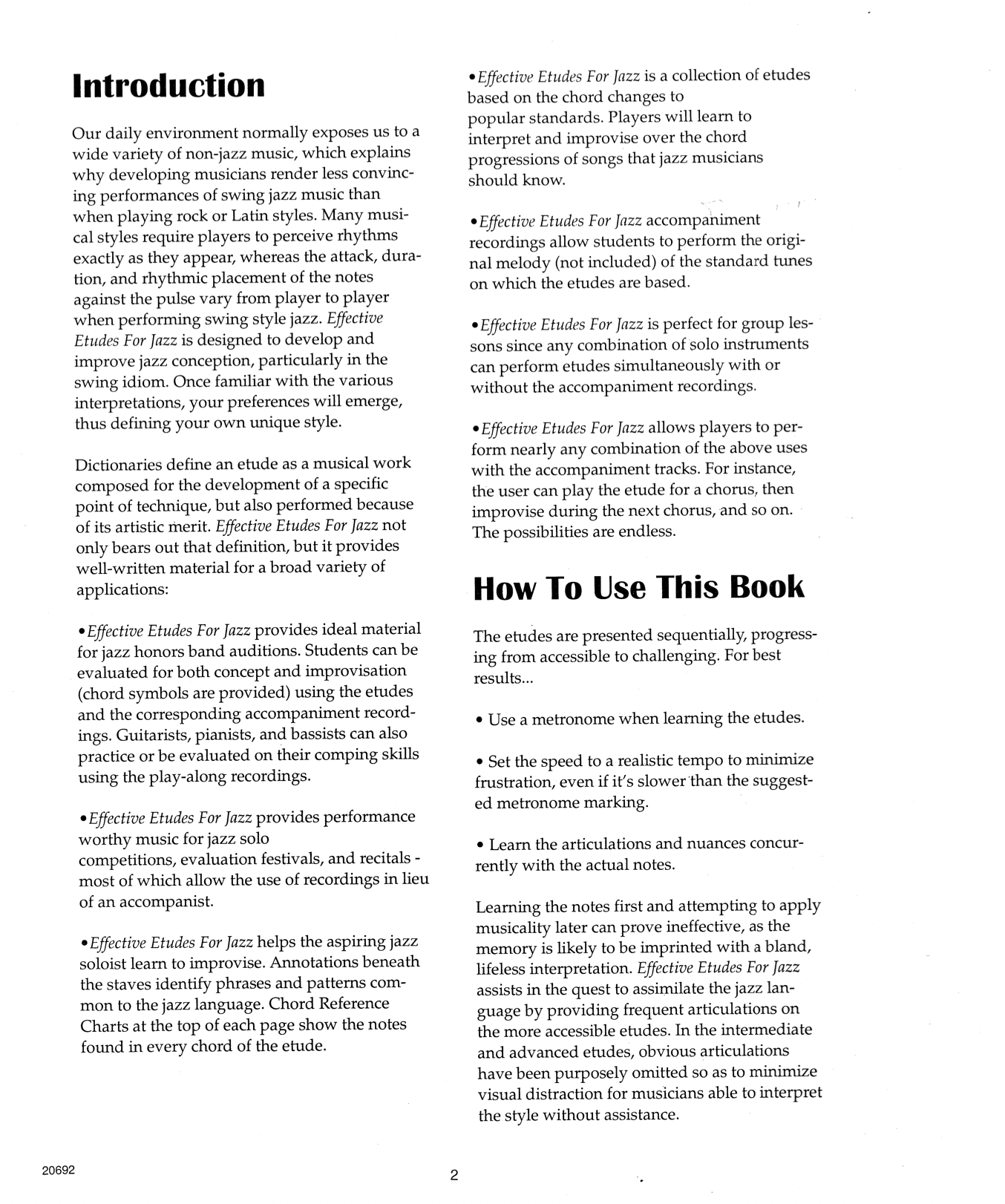 La collection a été conçue pour les auditions de groupes de jazz honorifiques, les évaluations en solo, les cours de groupe, l'enseignement du langage et de l'improvisation jazz, les normes d'apprentissage, etc. Présentées séquentiellement selon la difficulté, les études ont des annotations sous les portées identifiant des phrases et des modèles communs à la langue jazz. Les tableaux de référence d'accords montrent aux utilisateurs les notes de tous les symboles d'accord dans chaque étude. Chaque livre est accompagné d'enregistrements MP3 d'une section rythmique professionnelle et d'un soliste interprétant toutes les études, ainsi que de pistes d'accompagnement séparées sans le soliste.