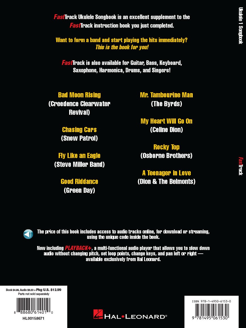 Ce recueil est un excellent complément au FastTrack Ukulele Method Book 1. Il comprend 8 chansons, et un code unique pour accéder aux pistes audio en ligne pour le streaming ou le téléchargement afin d'écouter la musique et de jouer quand vous êtes prêt.