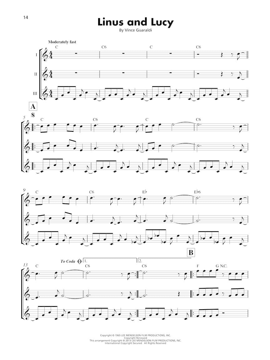 Chaque arrangement comprend la mélodie, une partie harmonique et une ligne de basse. Des symboles d'accords sont également fournis si vous souhaitez ajouter une partie rythmique. Pour les groupes de plus de trois ou quatre ukulélés, les parties peuvent être doublées.