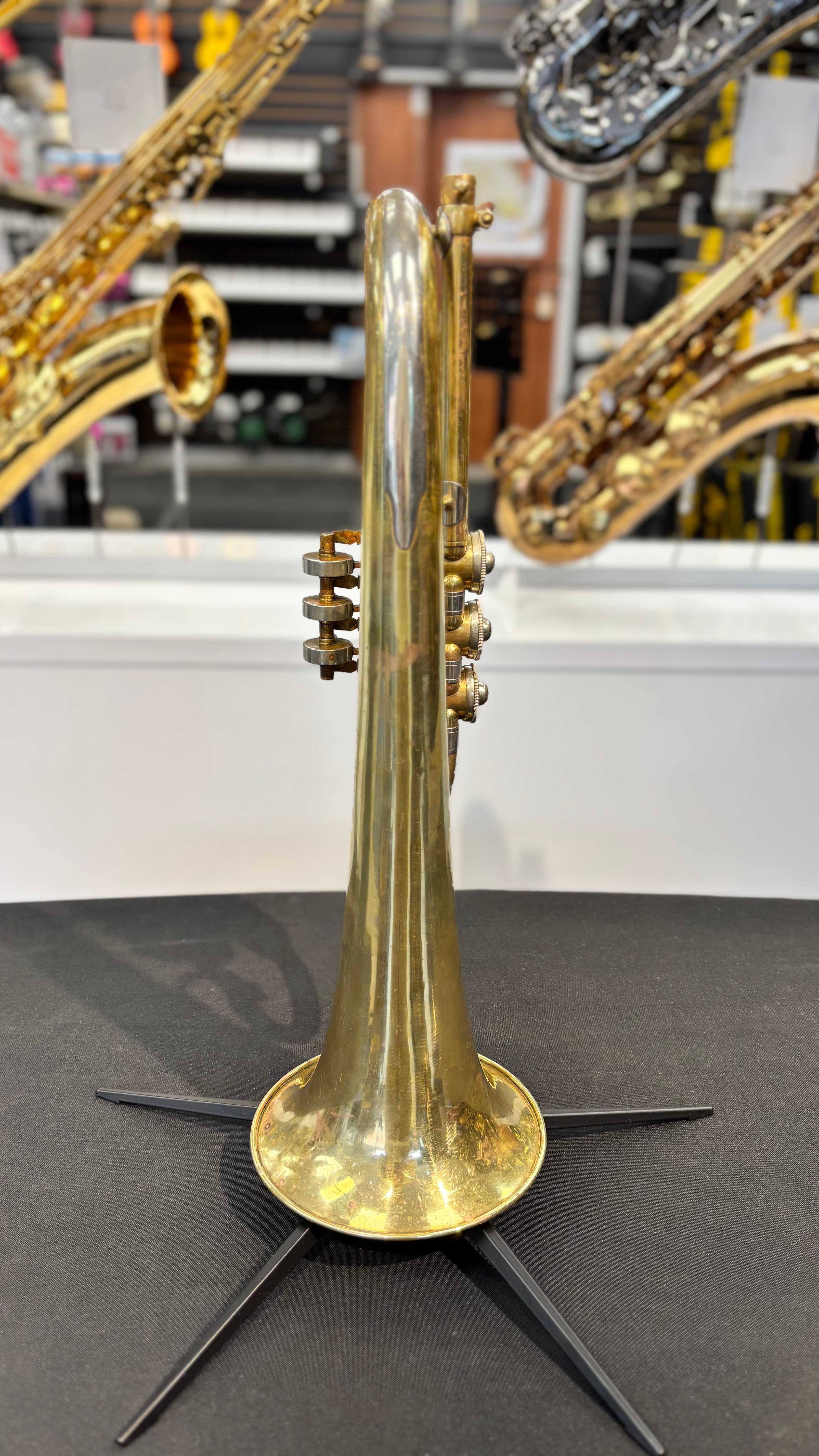 Magnifique bugle saxon ancien d'occasion à pistons rotatifs. Son riche et chaleureux, parfait pour les collectionneurs ou les musiciens à la recherche d'un son vintage.