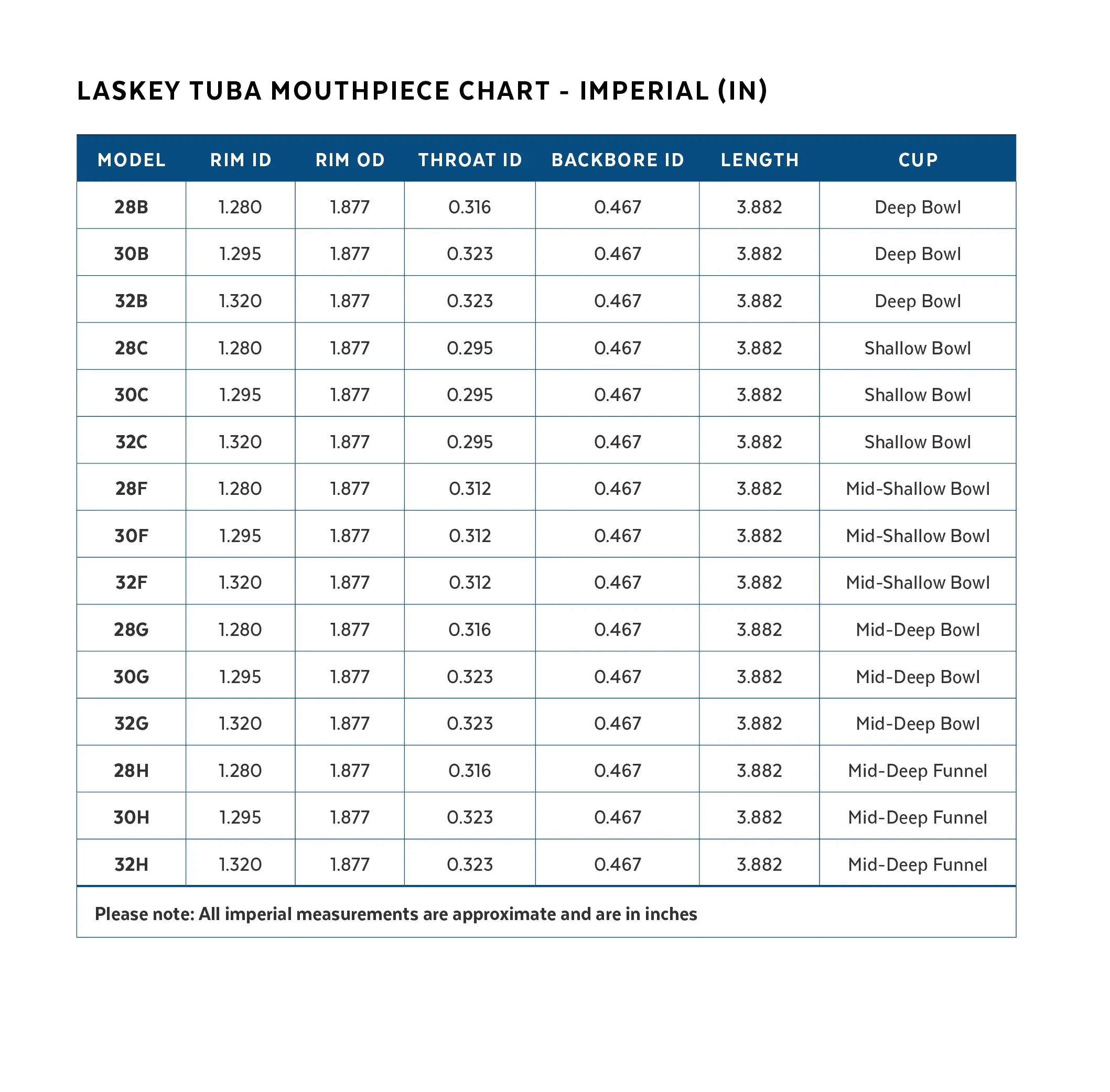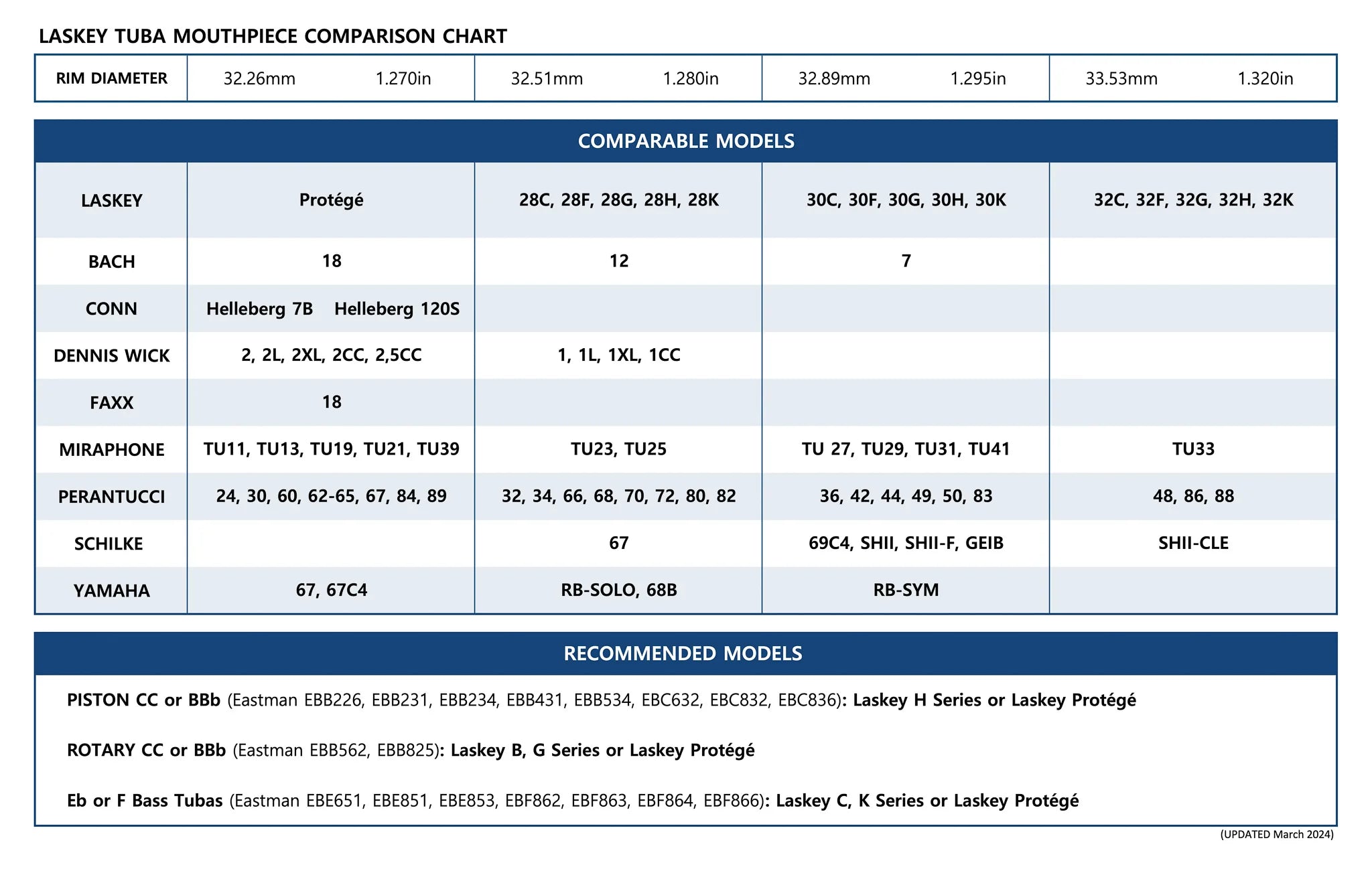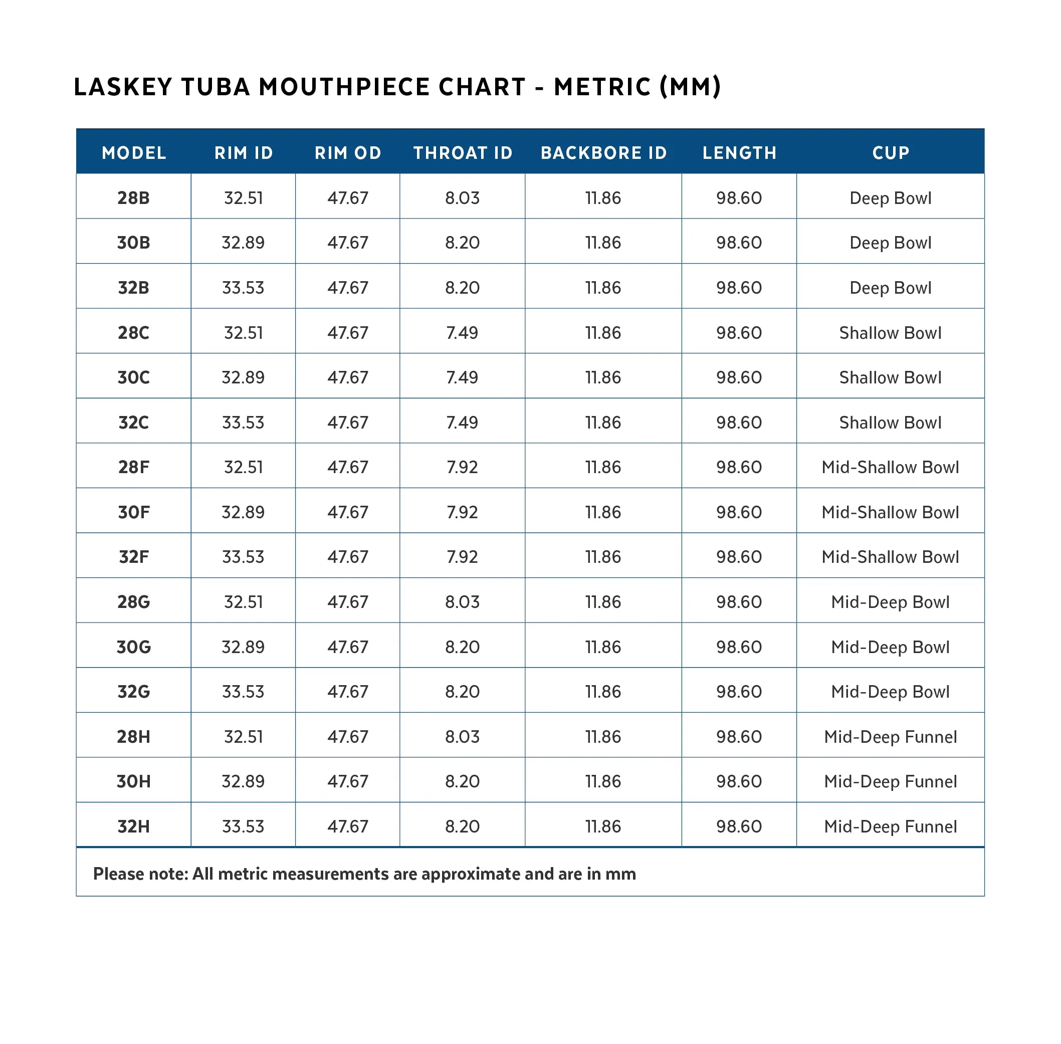 Les embouchures Laskey sont réputées pour leur ''rim'' confortable, leurs articulations claires, leur réponse et leur justesse. Le modèle american Shank est conçu pour les tubas de manufactures Américaines et l'option H ou G dépendent du type de pistons.