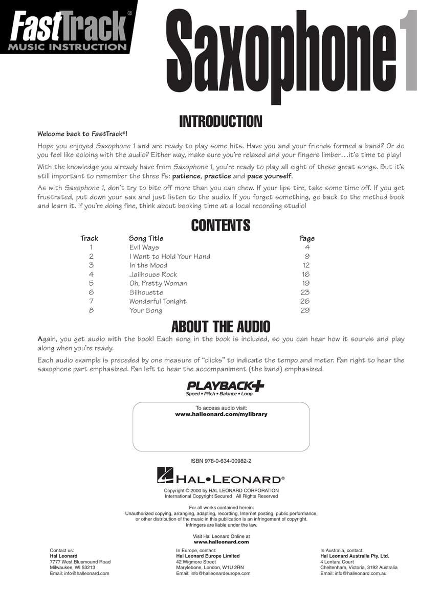 Ce recueil de chansons est un excellent complément au livre d'instructions FastTrack Saxophone 1. L'audio est accessible en ligne à l'aide du code unique à l'intérieur du livre et peut être diffusé en continu ou téléchargé.