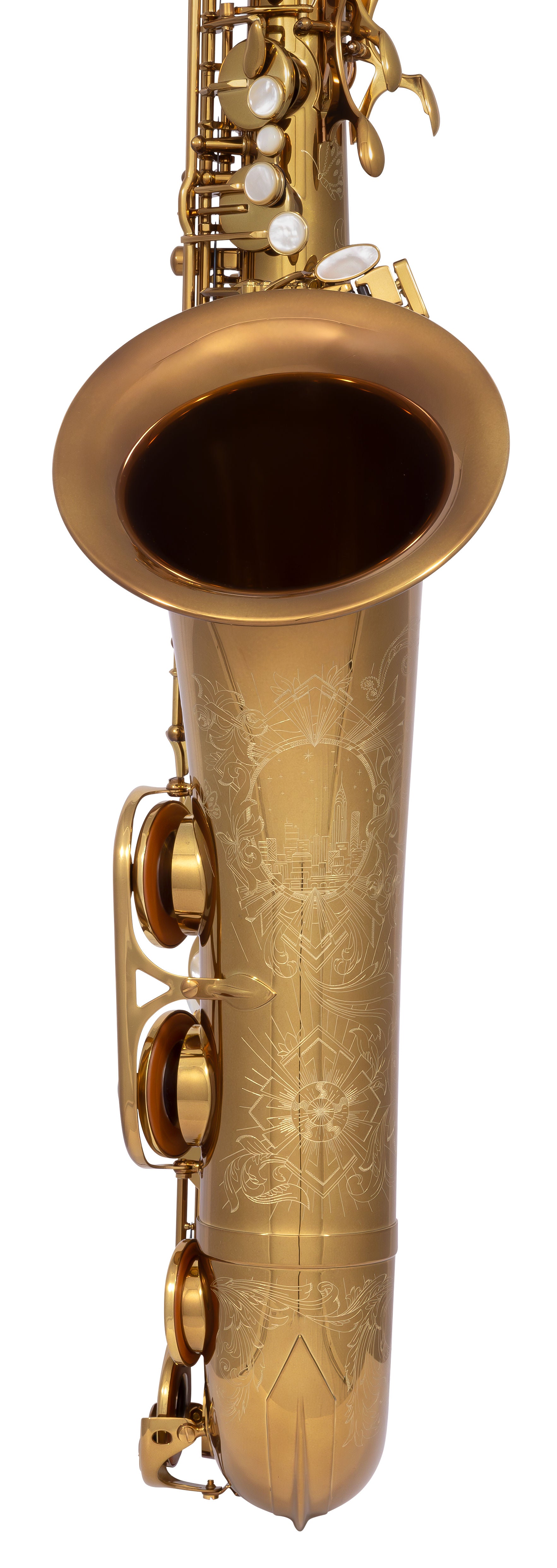 Le pavillon, le pavillon et le corps du modèle Signature USA NYC sont ornés de gravures Art déco raffinées, représentant des motifs et des icônes d'antan ainsi qu'une vue panoramique de New York. L'instrument est recouvert d'un vernis noir Elkhart Dark Lacquer unique à base de nitrocellulose. Les tampons haut de gamme, fabriqués en France, sont équipés d'une réinterprétation moderne des résonateurs ToneX des années 1950 : des disques bombés en nickel massif usinés, avec fixations à vis réutilisables.