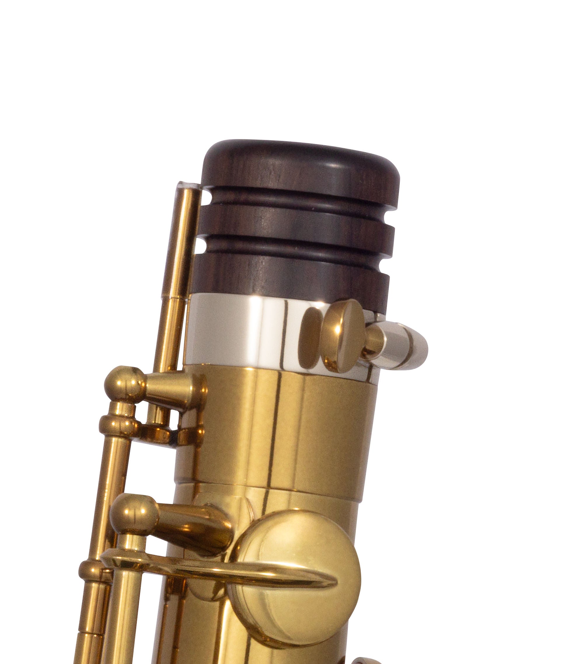 Chaque manche, orné du logo classique en forme de « S » bleu représentant une clé d'octave, est méticuleusement apparié à son corps et marqué d'un numéro de série unique. La fixation du manche au corps est assurée par un anneau de serrage concentrique en maillechort, signature de Selmer.