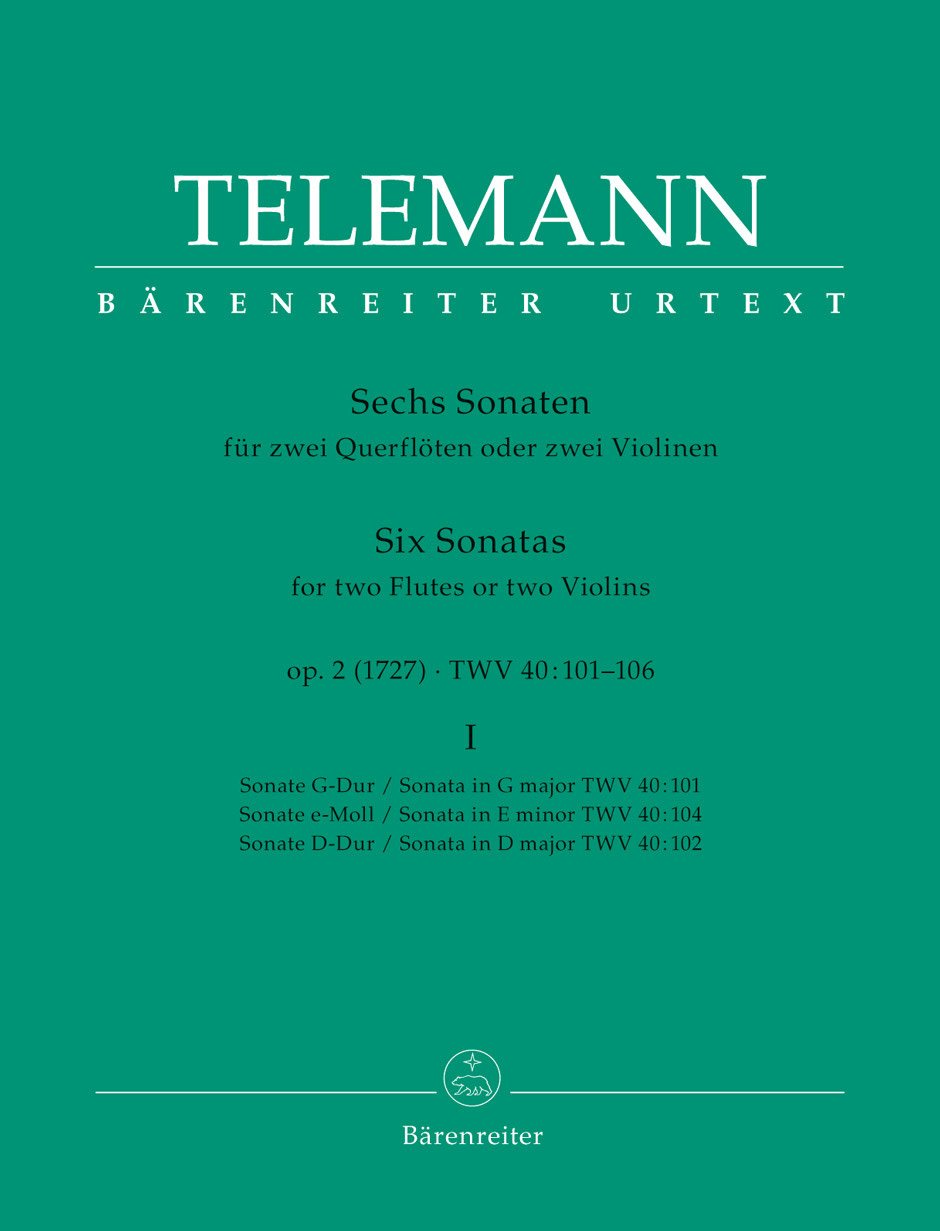 Partition flûte duo (2 exemplaires nécessaires à l'interprétation). Avec notation en duo et texte d'introduction. Opus 2, TWV 40:101, 102, 104. 25 pages. Baerenreiter Verlag #BA02979. Publié par Baerenreiter Verlag (BA.BA02979).