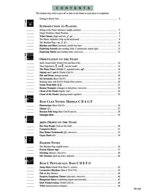Book 1 covers fundamental rhythms, all the notes of the grand staff, C position, G position.