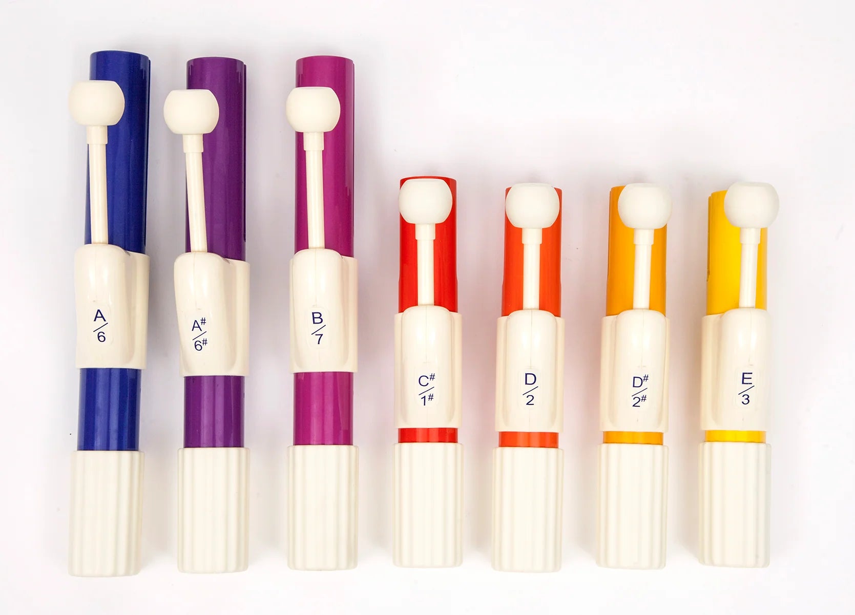 Manufactured to the highest standards, the top quality construction and accurate intonation make these student hand chimes the best value available. The CHROMA-NOTES® colors make it more fun to learn and play along with Boomwhackers®! Each metal student hand chime is marked with the proper note and number to help children learn the musical scale. This set gives you the extended range of a Low A to High E. Add this to the CNC8 and CNC5 (sold separately) to create a 20 student hand chime set!