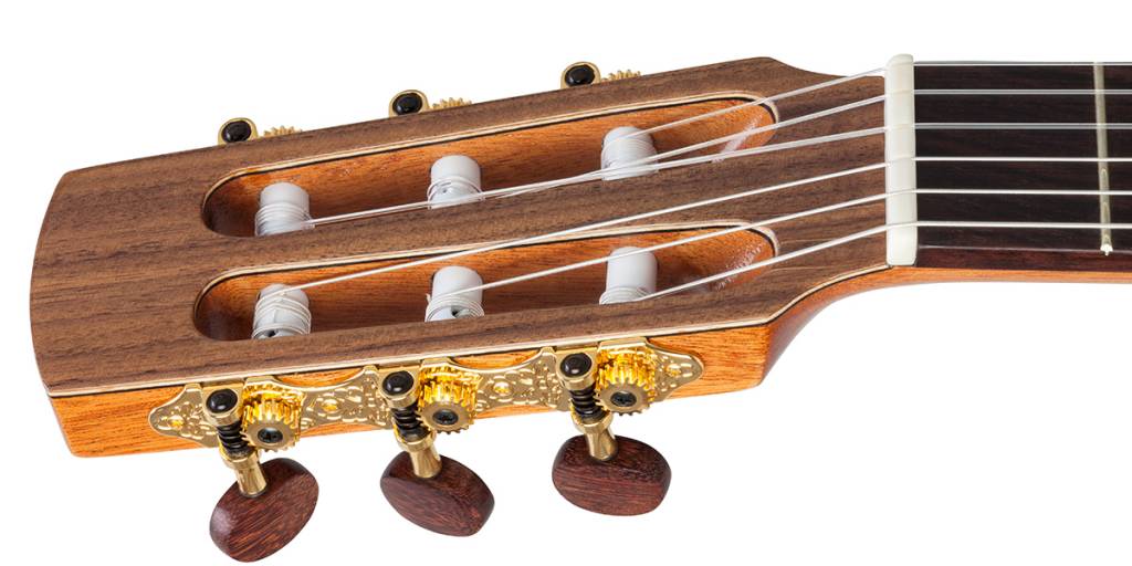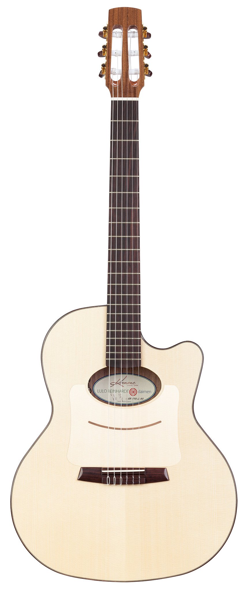 Together with Lulo Reinhardt we created guitars versatile enough to handle Lulo’s Gypsy stylings – Lulo is the grandnephew of Gypsy Jazz legend Django Reinhardt—and modern styles contributing to his performances and recordings. With 14 frets to the body and a narrow 48 mm neck width, Daimen delivers the tonal benefits of nylon strings to guitarists seeking performance features similar to a steel string guitar. The Daimen is equipped with the LR Baggs Element Active system.