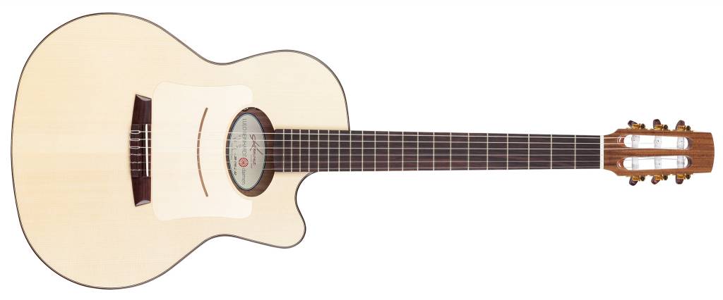 14 frets to body; Solid European spruce top; Bulgarian walnut back and sides; gloss finish; Honduras cedar neck with dual action truss rod; rosewood fingerboard with 500 mm radius; rosewood Montmarte-styled bridge; bone nut and saddle; hand inlaid wood binding/Ars Minima rosette; Venetian cutaway; gold machines with rosewood buttons; LR Baggs Element Active system; 650 mm scale length; 48 mm neck width at nut; Kremona Arete strings; deluxe archtop hardshell case