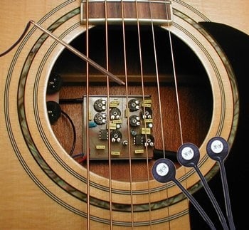 To keep the box as small as possible these controls are trim pots (small potentiometers for adjustment with a precision screw driver which is supplied). Once you've installed the two pickups, you can adjust the trim pots to your personal taste and needs. During performance, the two volume knobs on the outside allow for fast balancing on the fly.