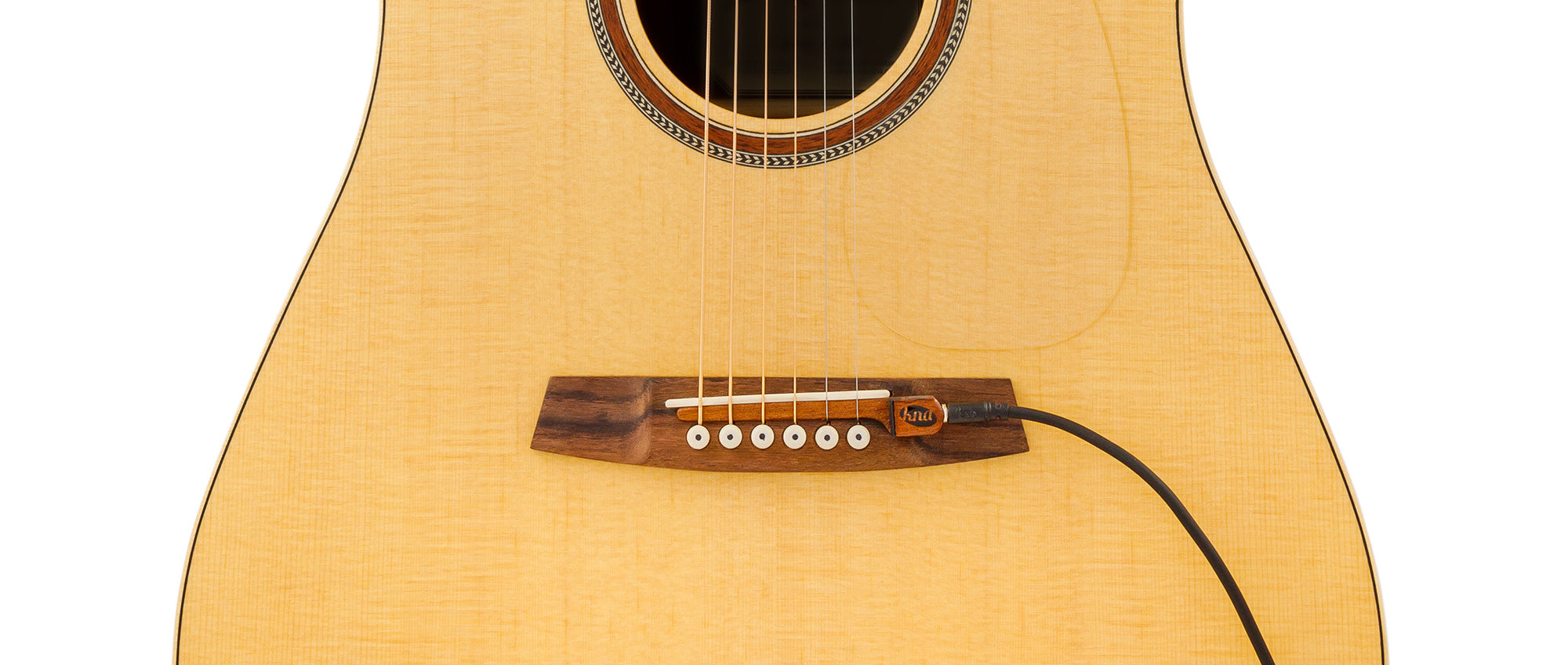 Encased in lightweight tone-wood, SG-1 ensures the natural amplified sound of your guitar without modification to the instrument. Held in place by the tension of tuned strings, SG-1 installs safely and securely between the bridge saddle and pins. SG-1 may remain installed when not in used. SG-1 comes with a complimentary detachable and easily replaceable 1/8’’ to 1/4’’ cable.